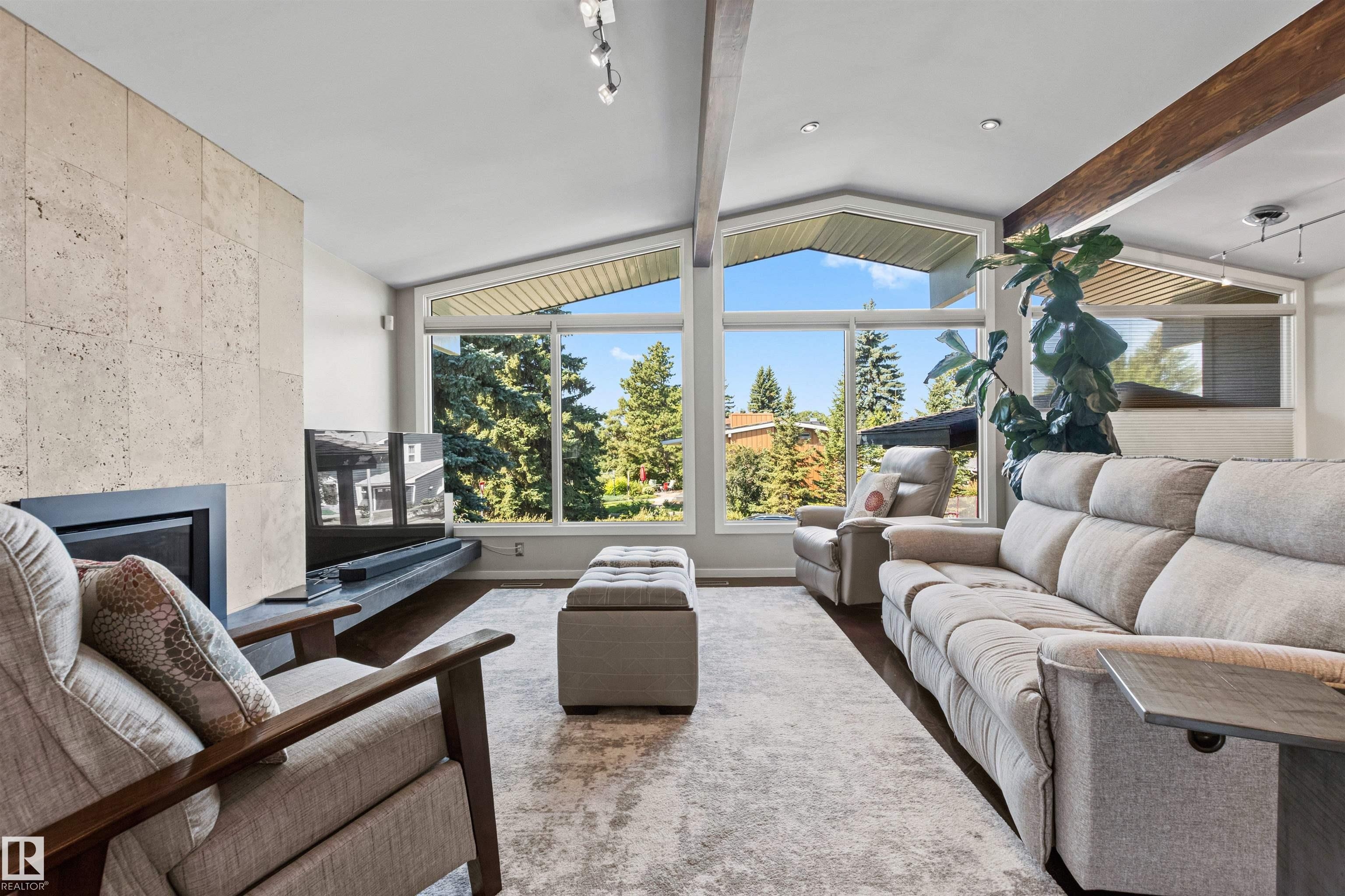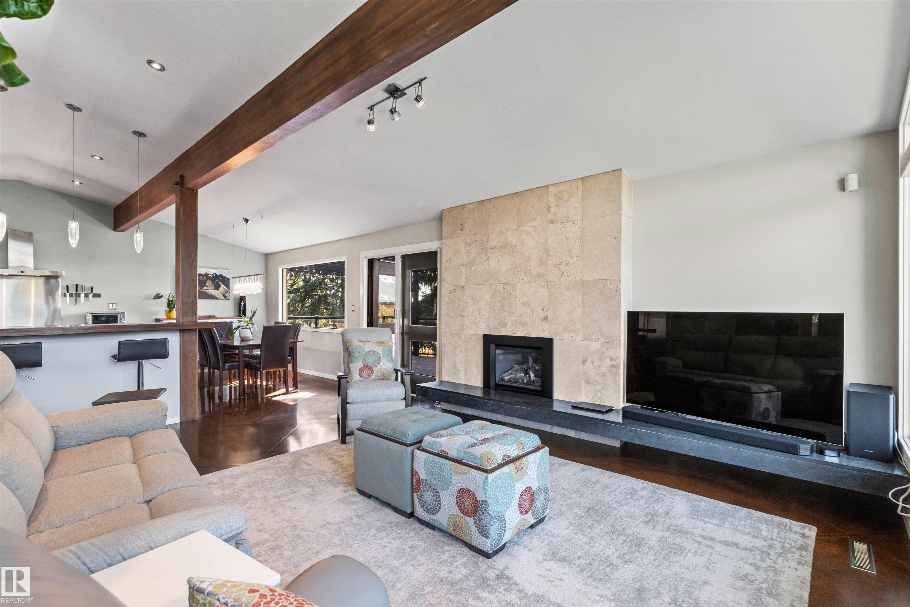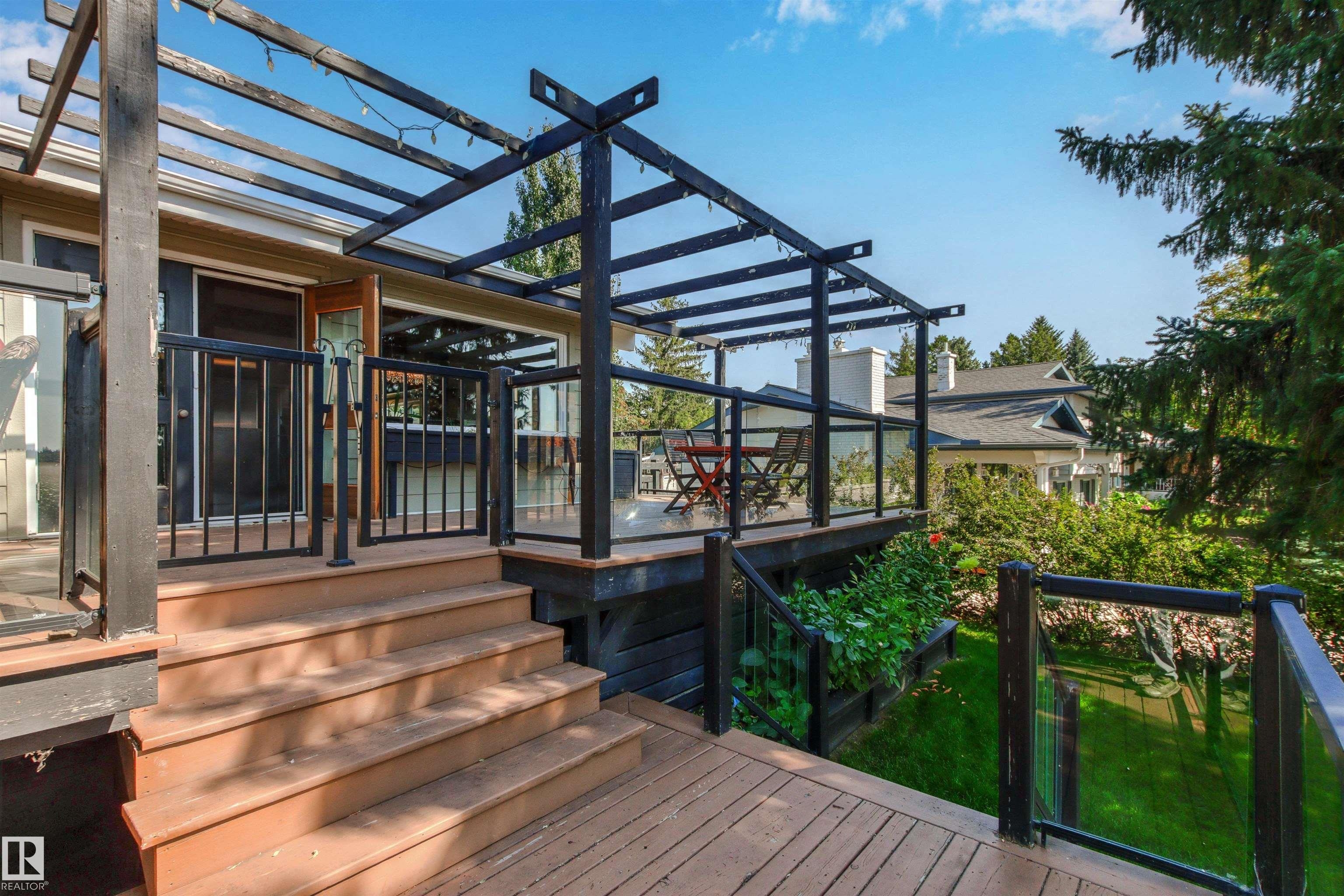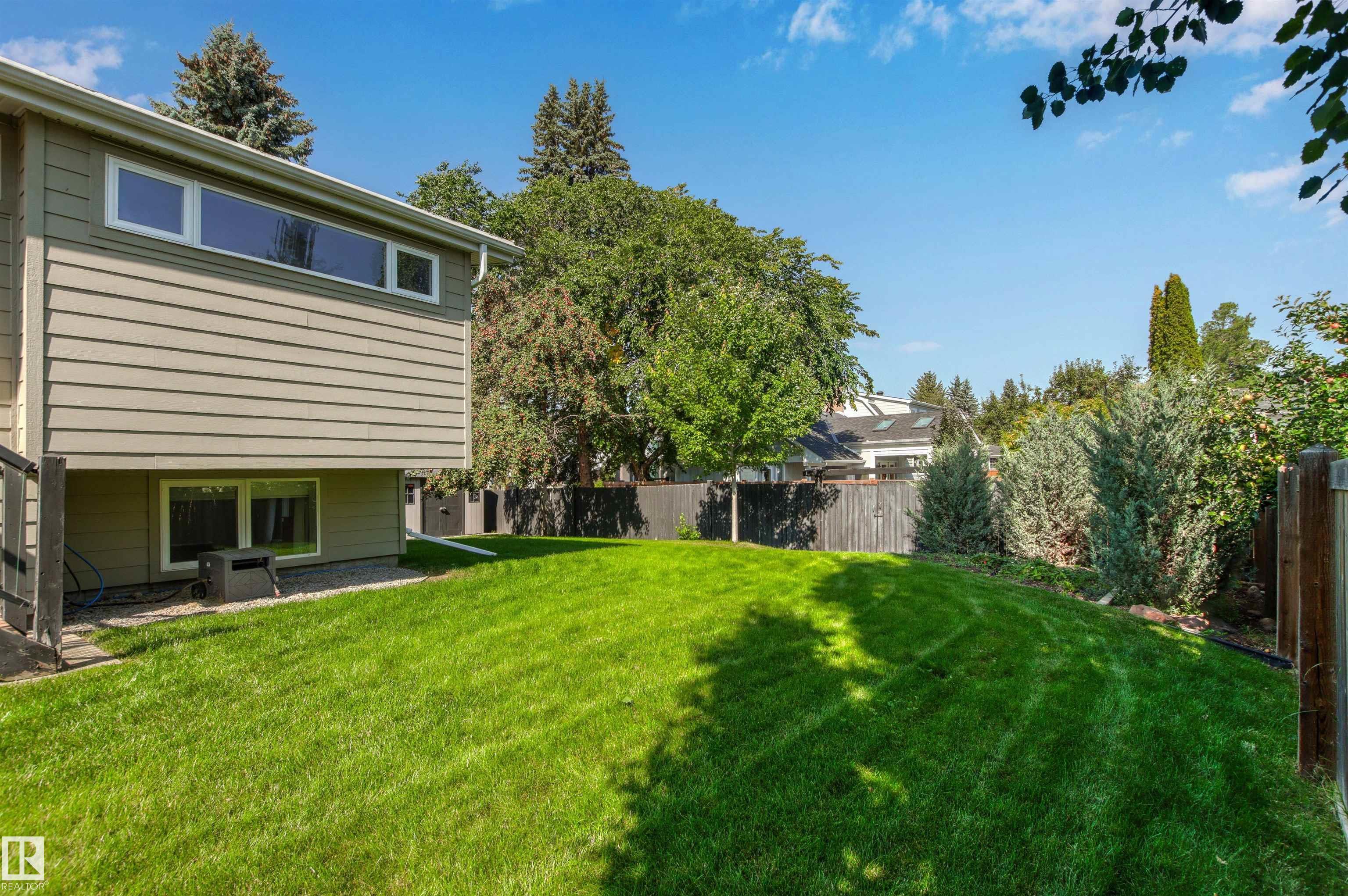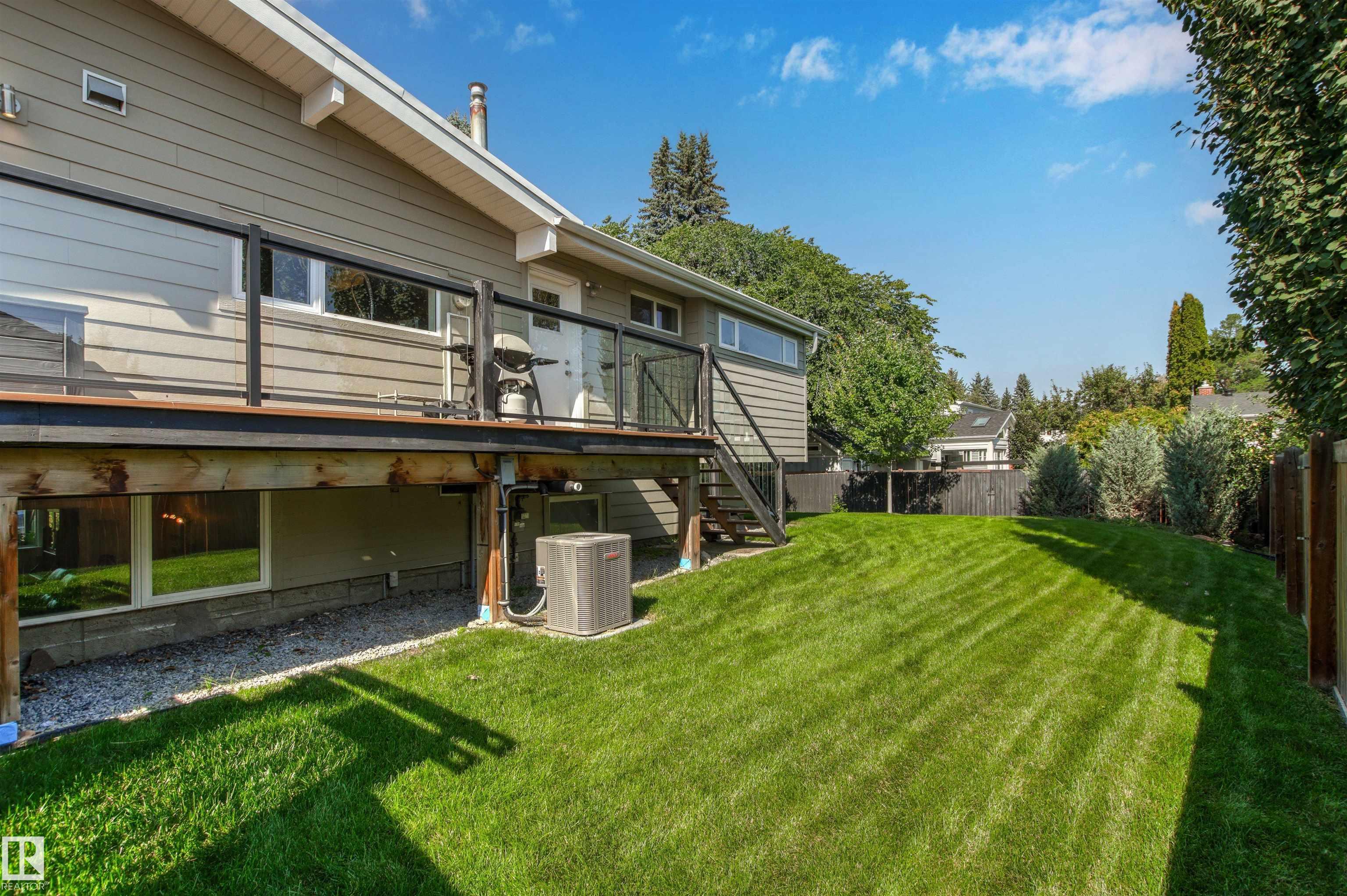 Welcome to this beautifully renovated & updated 1646 sq ft bi-level located in the desirable Grandview Heights steps to the highly rated K-9 school, the trail systems of the river valley, the U of A & hospitals, & a short commute to downtown. The main floor offers a chic modern kitchen with stainless steal cabinetry, limestone counters, high end appliances, solid wood accents & unique glass island. Natural light streams through a wall of soaring windows into the adjacent living room with a gas fireplace & limestone surround. The dining room, also with a huge window has garden door access to the west deck overlooking the farm. Three bedrooms, one with a 3-piece ensuite, a 2-piece powder room & a spacious W-I pantry complete the main level. The fully developed lower level has a rec room with a wood-burning fireplace, two additional bedrooms, a 4-pce bathroom/laundry, & access to the over-sized heated double attached garage. Over 100K has recently been spent on upgrades in this terrific move-in ready home.