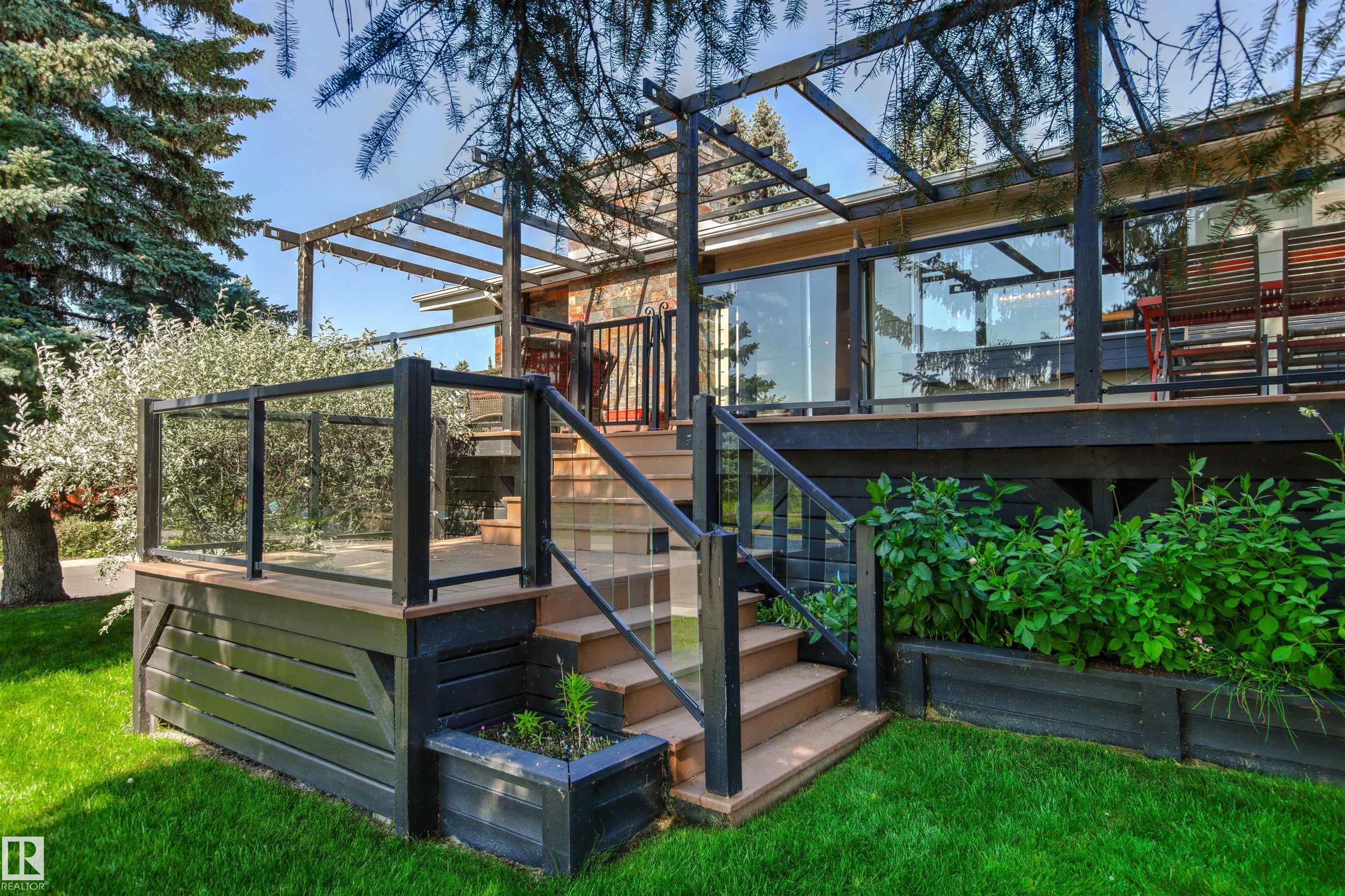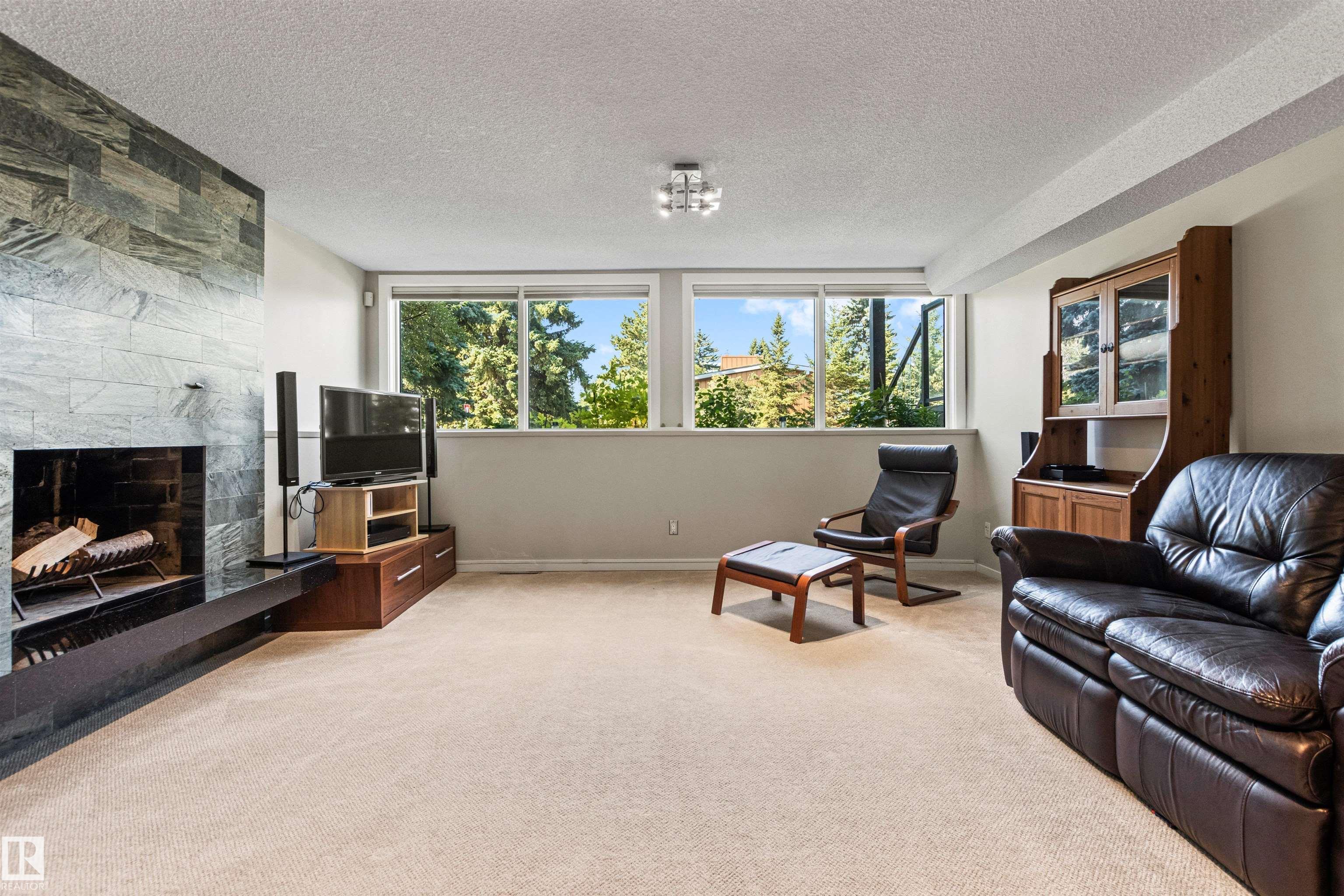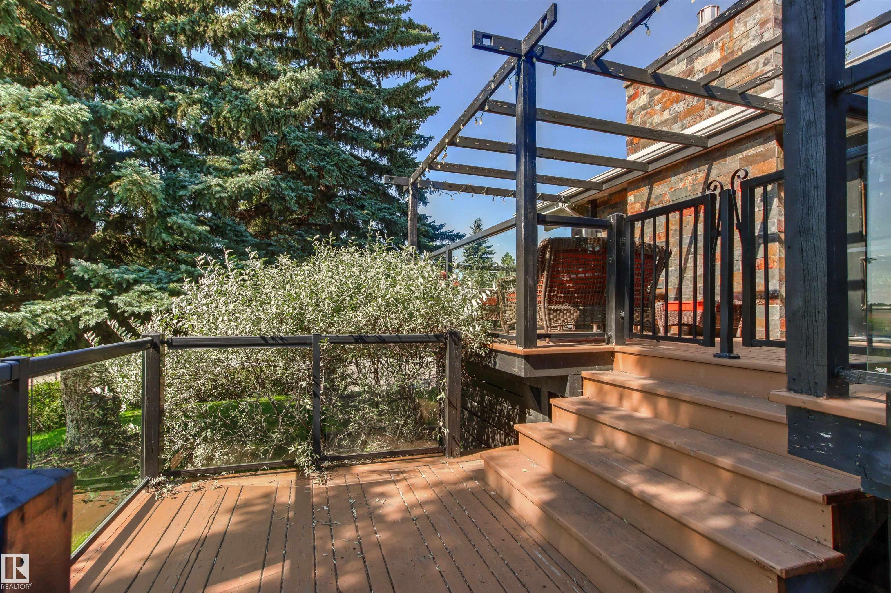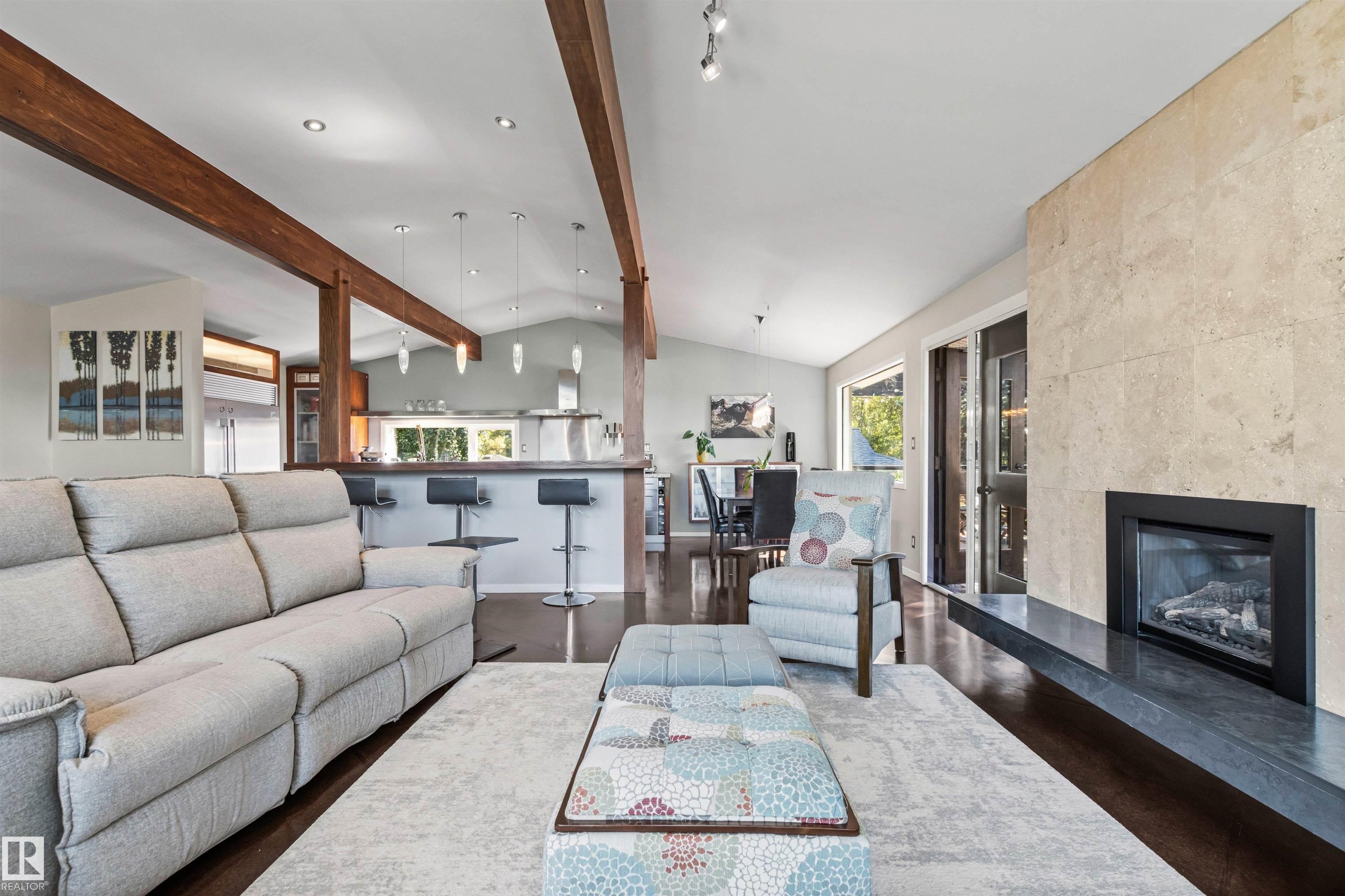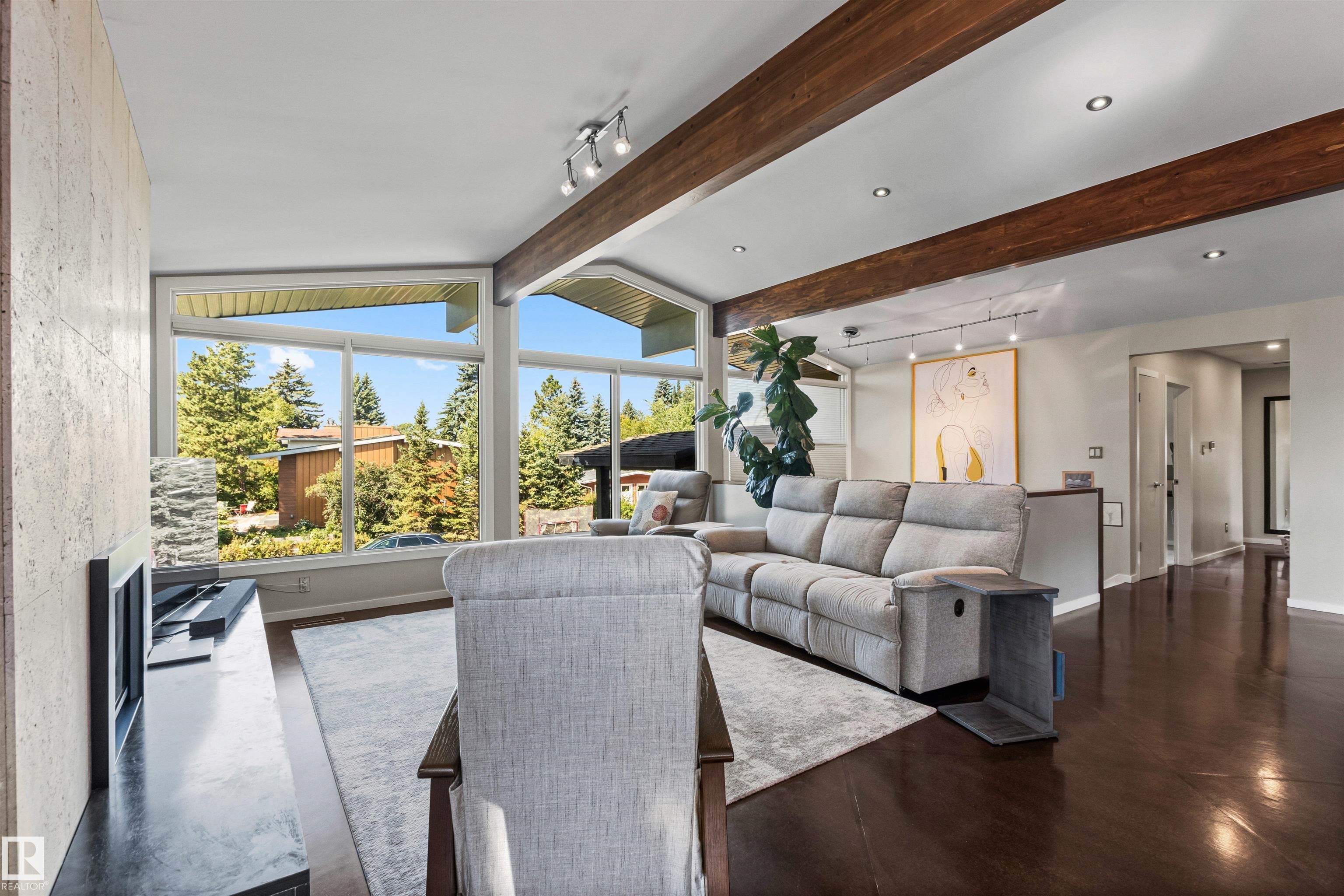 Welcome to this beautifully renovated & updated 1646 sq ft bi-level located in the desirable Grandview Heights steps to the highly rated K-9 school, the trail systems of the river valley, the U of A & hospitals, & a short commute to downtown. The main floor offers a chic modern kitchen with stainless steal cabinetry, limestone counters, high end appliances, solid wood accents & unique glass island. Natural light streams through a wall of soaring windows into the adjacent living room with a gas fireplace & limestone surround. The dining room, also with a huge window has garden door access to the west deck overlooking the farm. Three bedrooms, one with a 3-piece ensuite, a 2-piece powder room & a spacious W-I pantry complete the main level. The fully developed lower level has a rec room with a wood-burning fireplace, two additional bedrooms, a 4-pce bathroom/laundry, & access to the over-sized heated double attached garage. Over 100K has recently been spent on upgrades in this terrific move-in ready home.