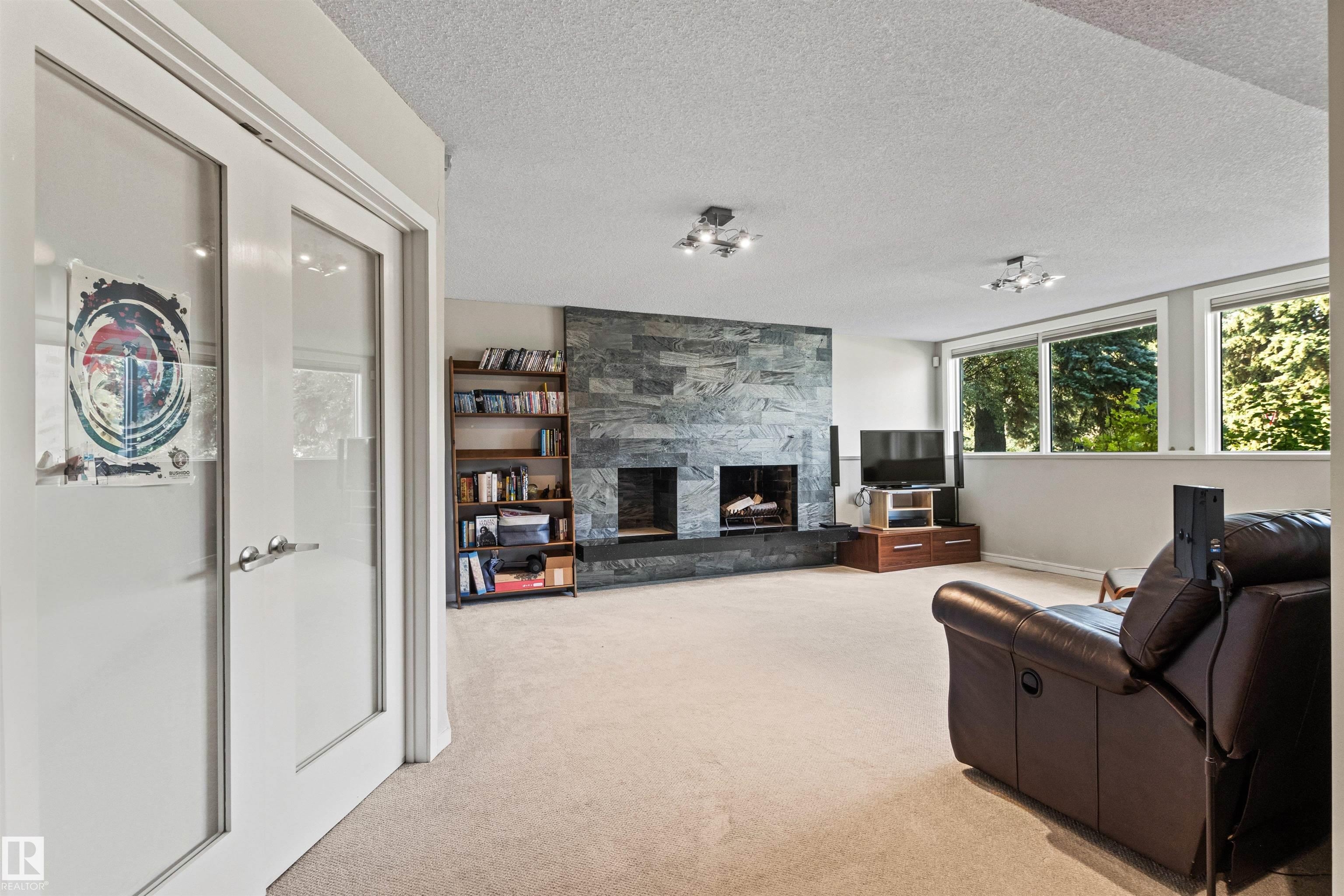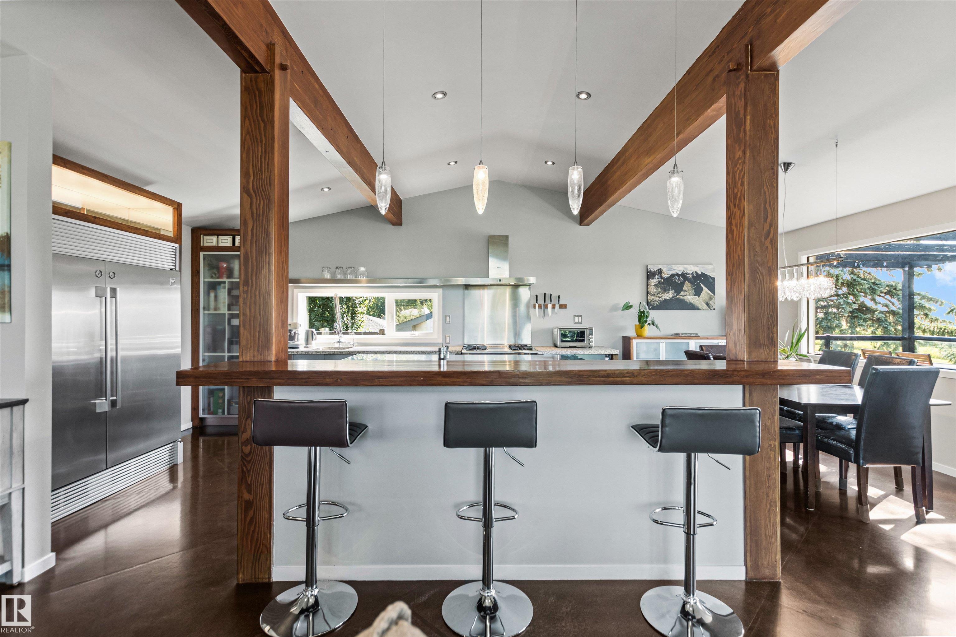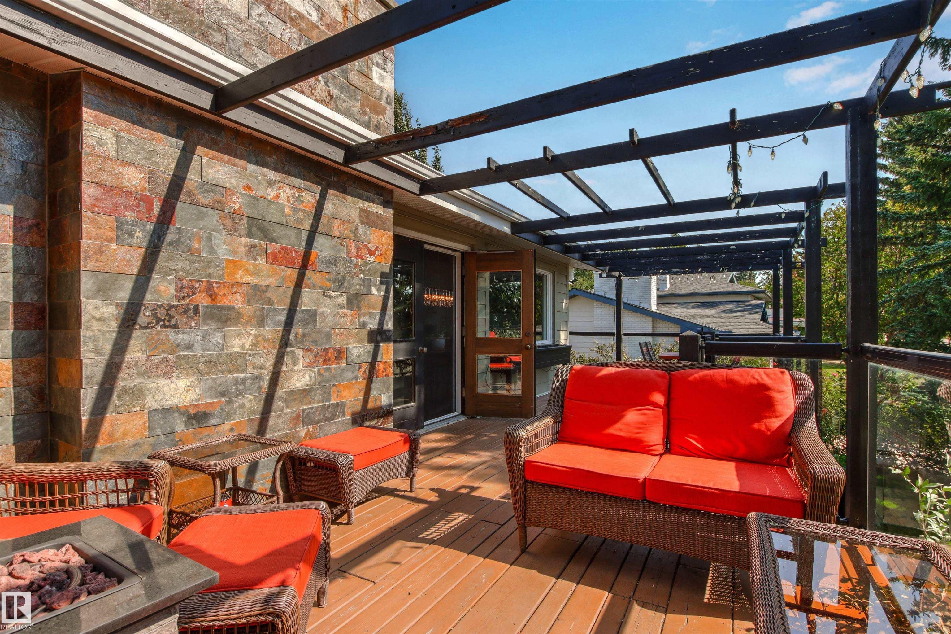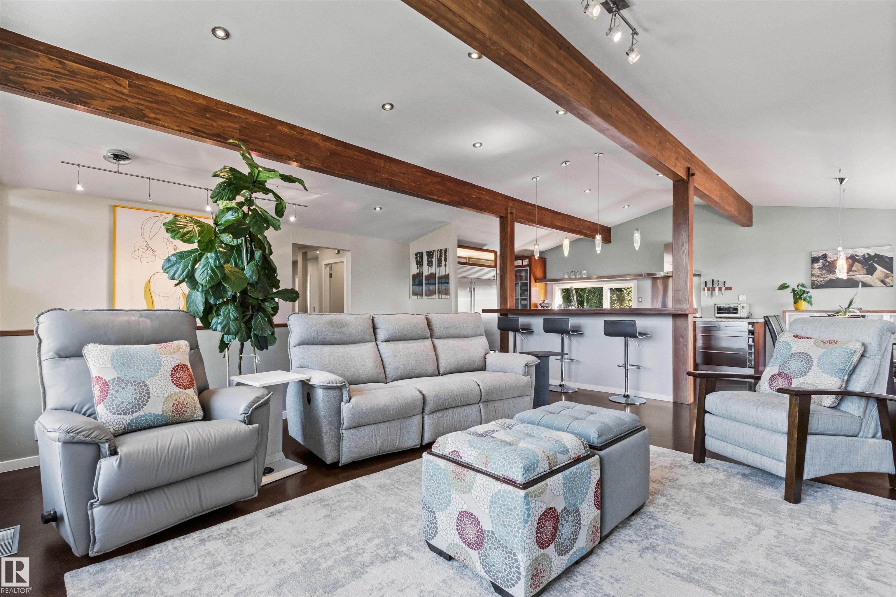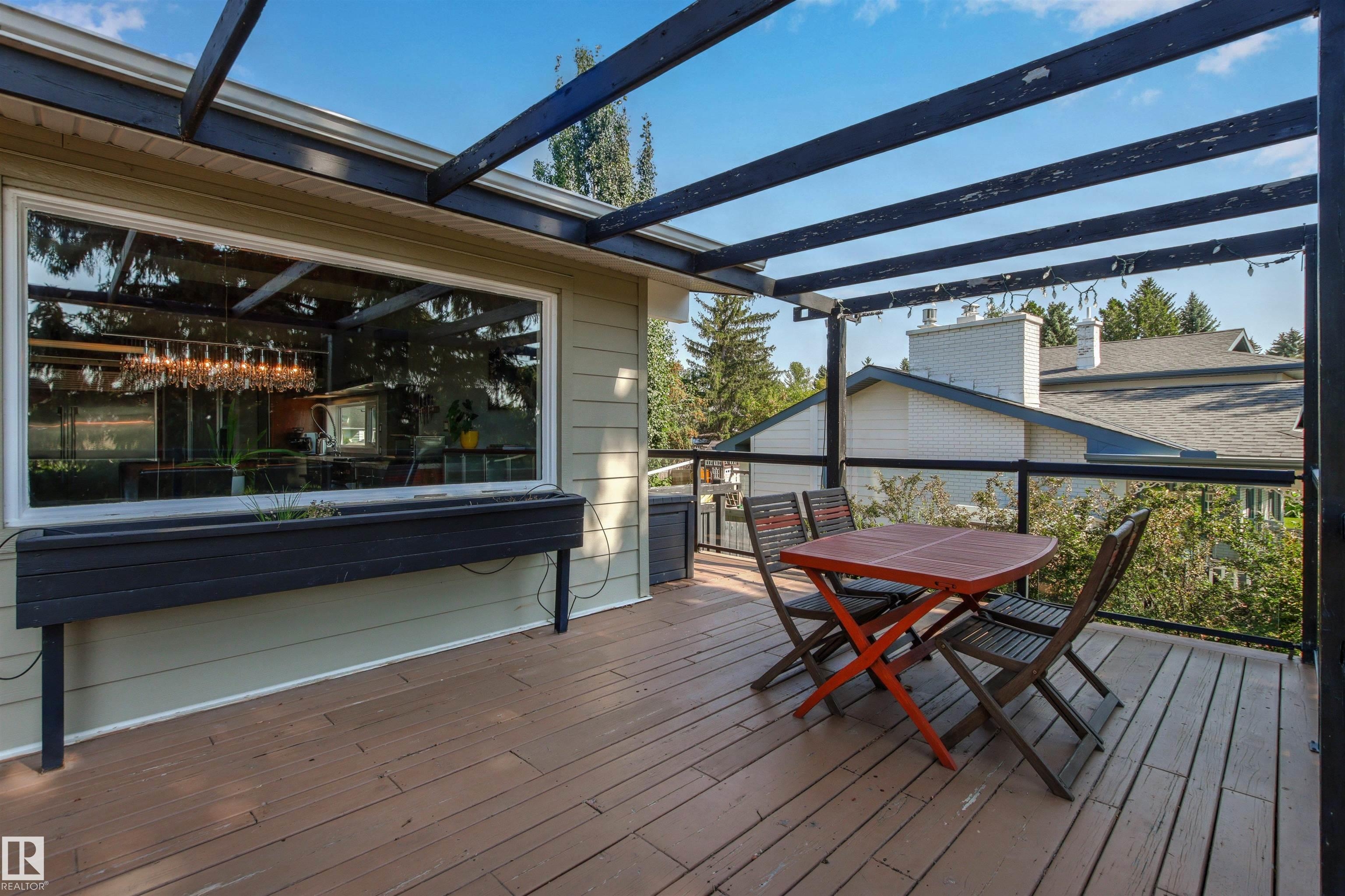 Welcome to this beautifully renovated & updated 1646 sq ft bi-level located in the desirable Grandview Heights steps to the highly rated K-9 school, the trail systems of the river valley, the U of A & hospitals, & a short commute to downtown. The main floor offers a chic modern kitchen with stainless steal cabinetry, limestone counters, high end appliances, solid wood accents & unique glass island. Natural light streams through a wall of soaring windows into the adjacent living room with a gas fireplace & limestone surround. The dining room, also with a huge window has garden door access to the west deck overlooking the farm. Three bedrooms, one with a 3-piece ensuite, a 2-piece powder room & a spacious W-I pantry complete the main level. The fully developed lower level has a rec room with a wood-burning fireplace, two additional bedrooms, a 4-pce bathroom/laundry, & access to the over-sized heated double attached garage. Over 100K has recently been spent on upgrades in this terrific move-in ready home.