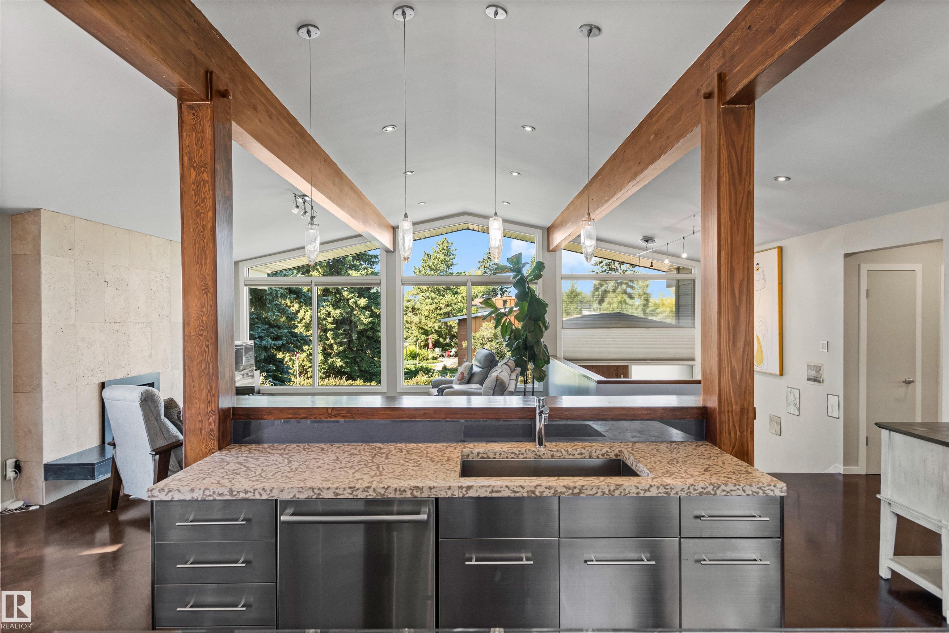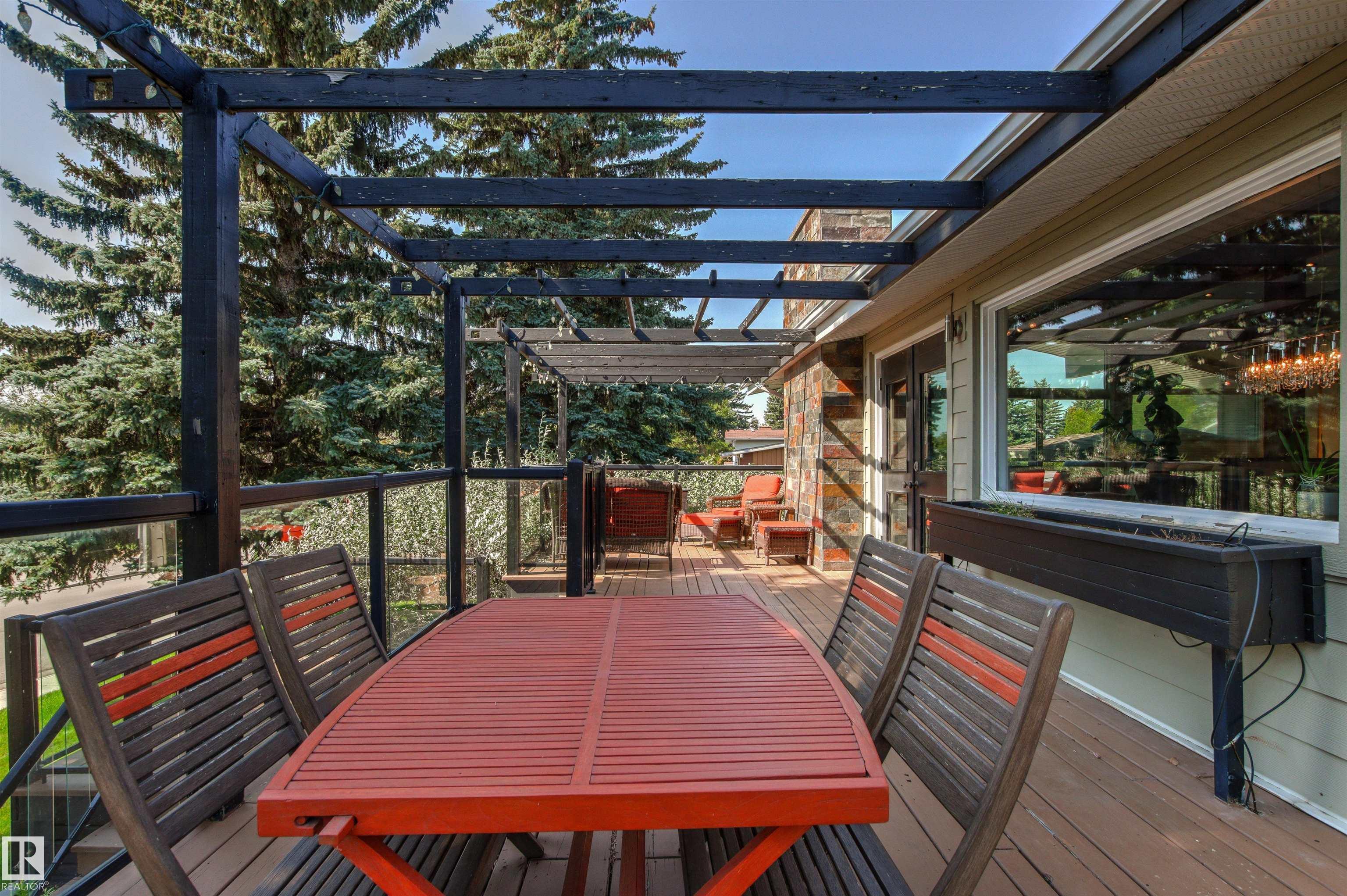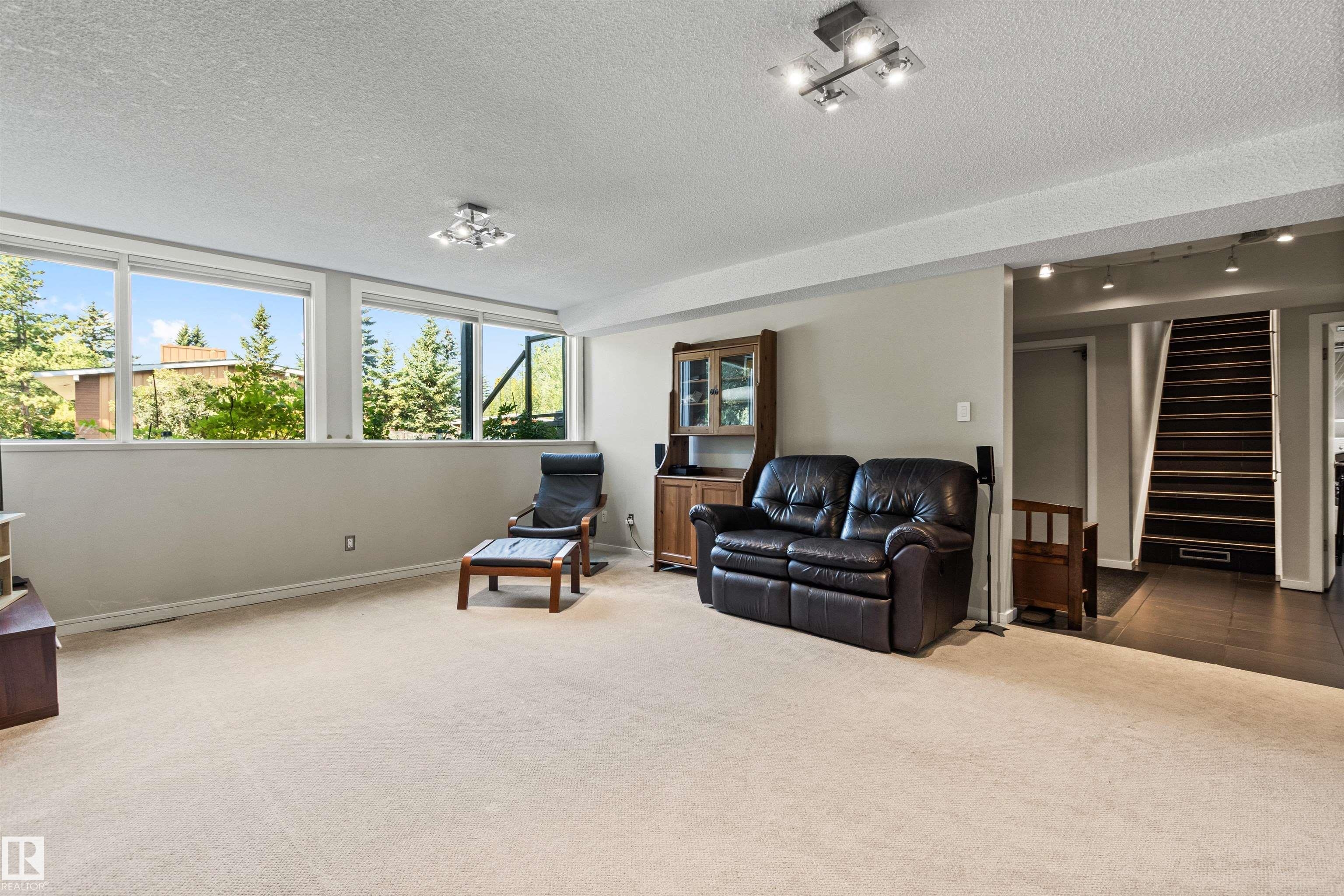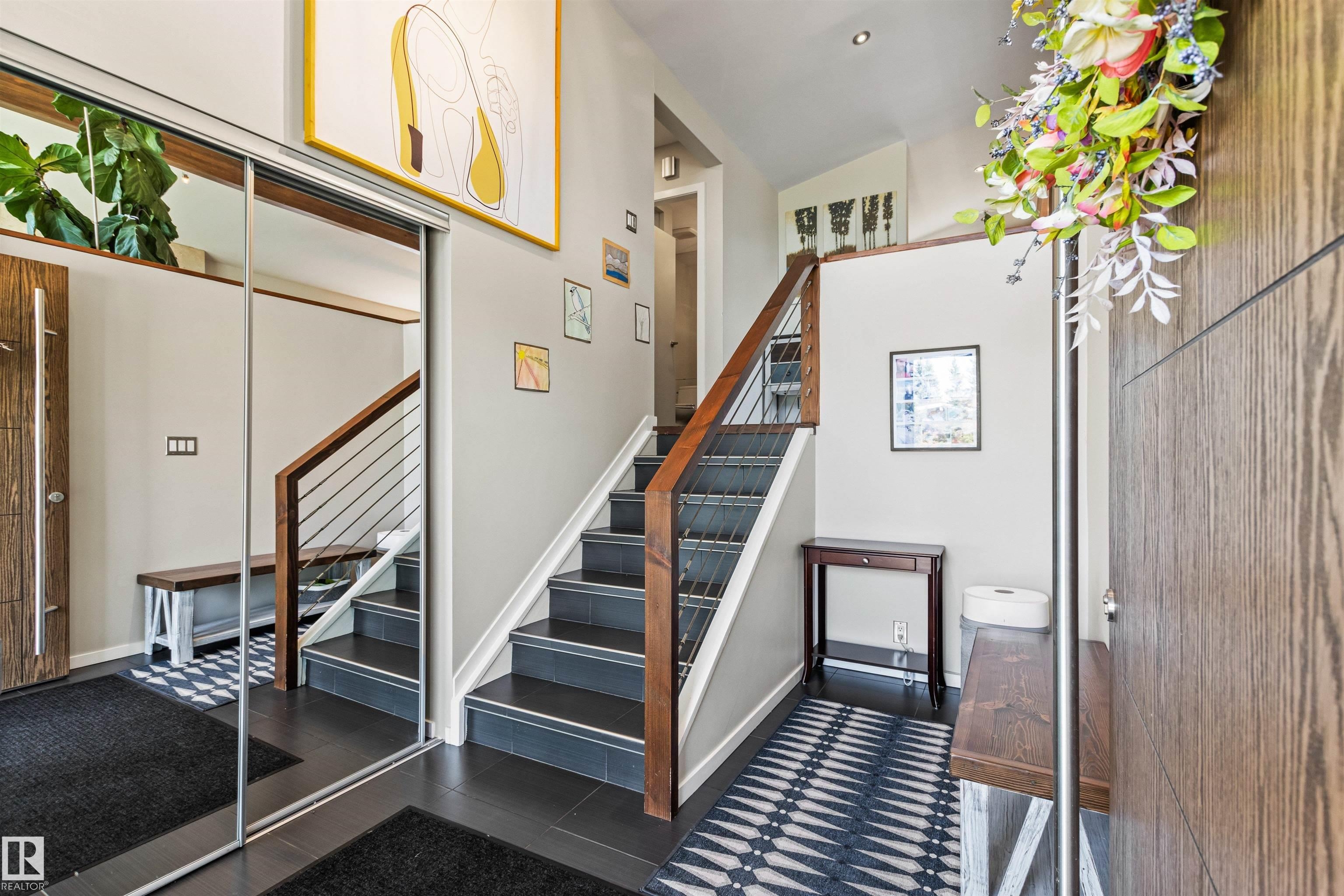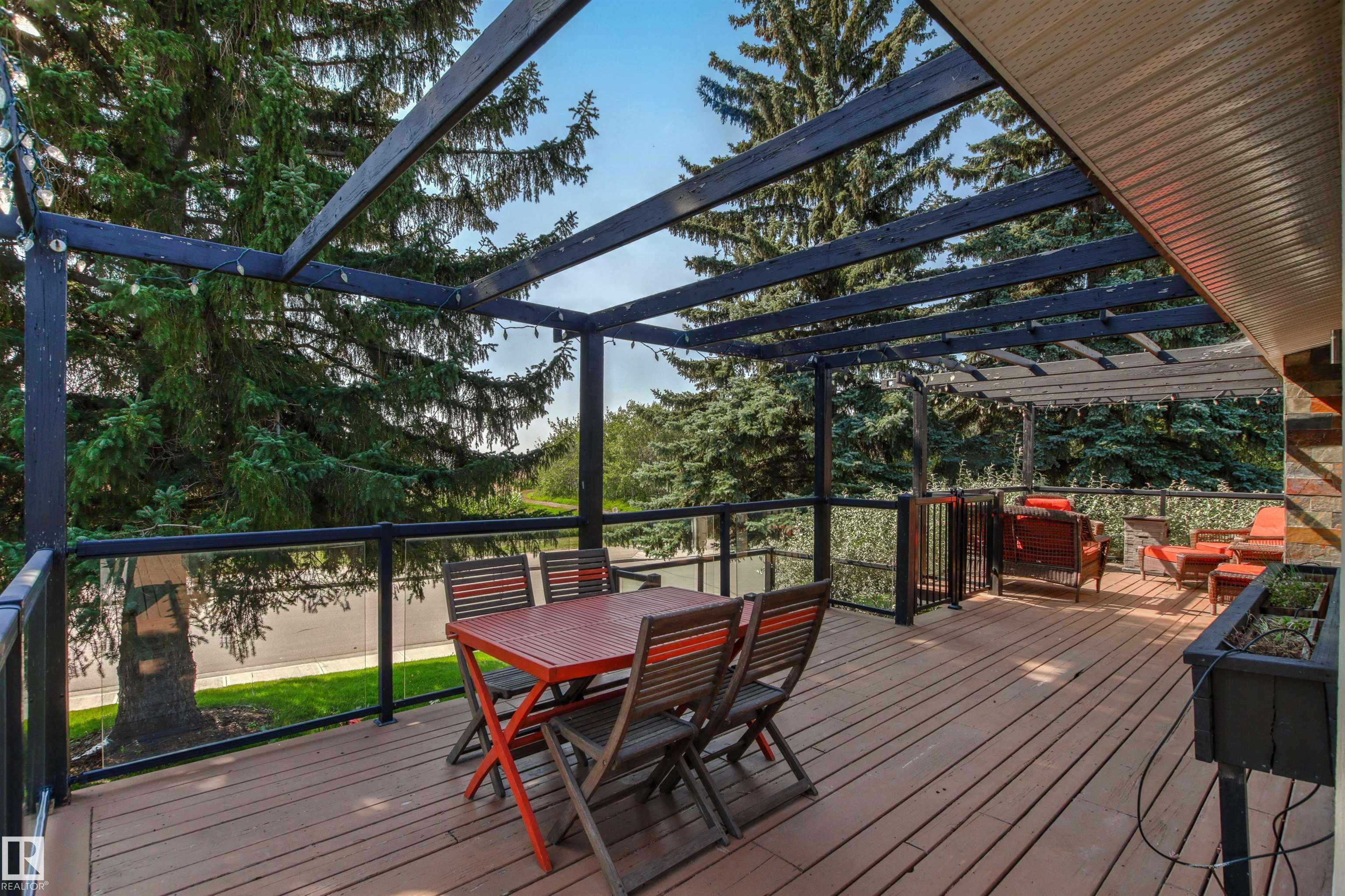 Welcome to this beautifully renovated & updated 1646 sq ft bi-level located in the desirable Grandview Heights steps to the highly rated K-9 school, the trail systems of the river valley, the U of A & hospitals, & a short commute to downtown. The main floor offers a chic modern kitchen with stainless steal cabinetry, limestone counters, high end appliances, solid wood accents & unique glass island. Natural light streams through a wall of soaring windows into the adjacent living room with a gas fireplace & limestone surround. The dining room, also with a huge window has garden door access to the west deck overlooking the farm. Three bedrooms, one with a 3-piece ensuite, a 2-piece powder room & a spacious W-I pantry complete the main level. The fully developed lower level has a rec room with a wood-burning fireplace, two additional bedrooms, a 4-pce bathroom/laundry, & access to the over-sized heated double attached garage. Over 100K has recently been spent on upgrades in this terrific move-in ready home.