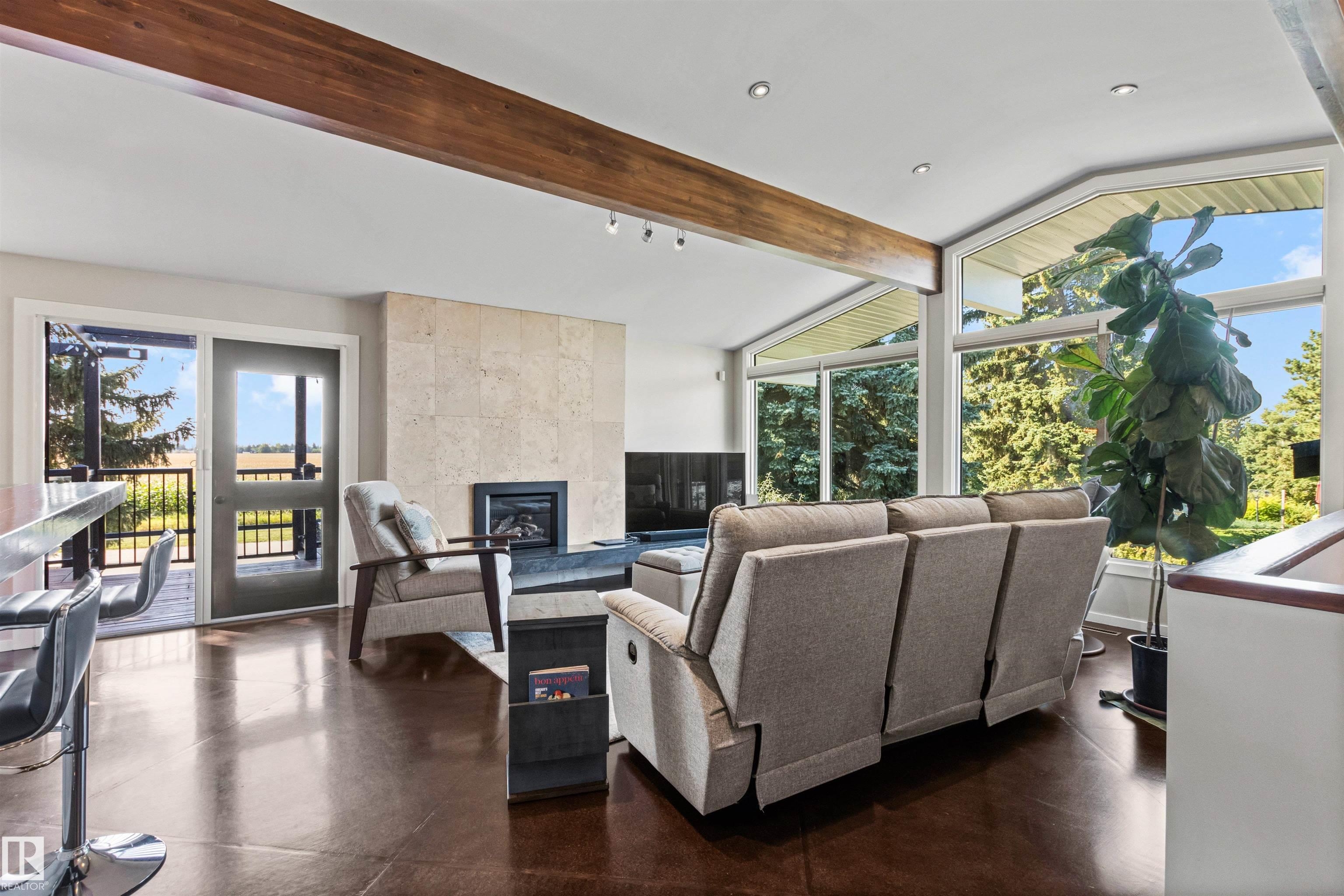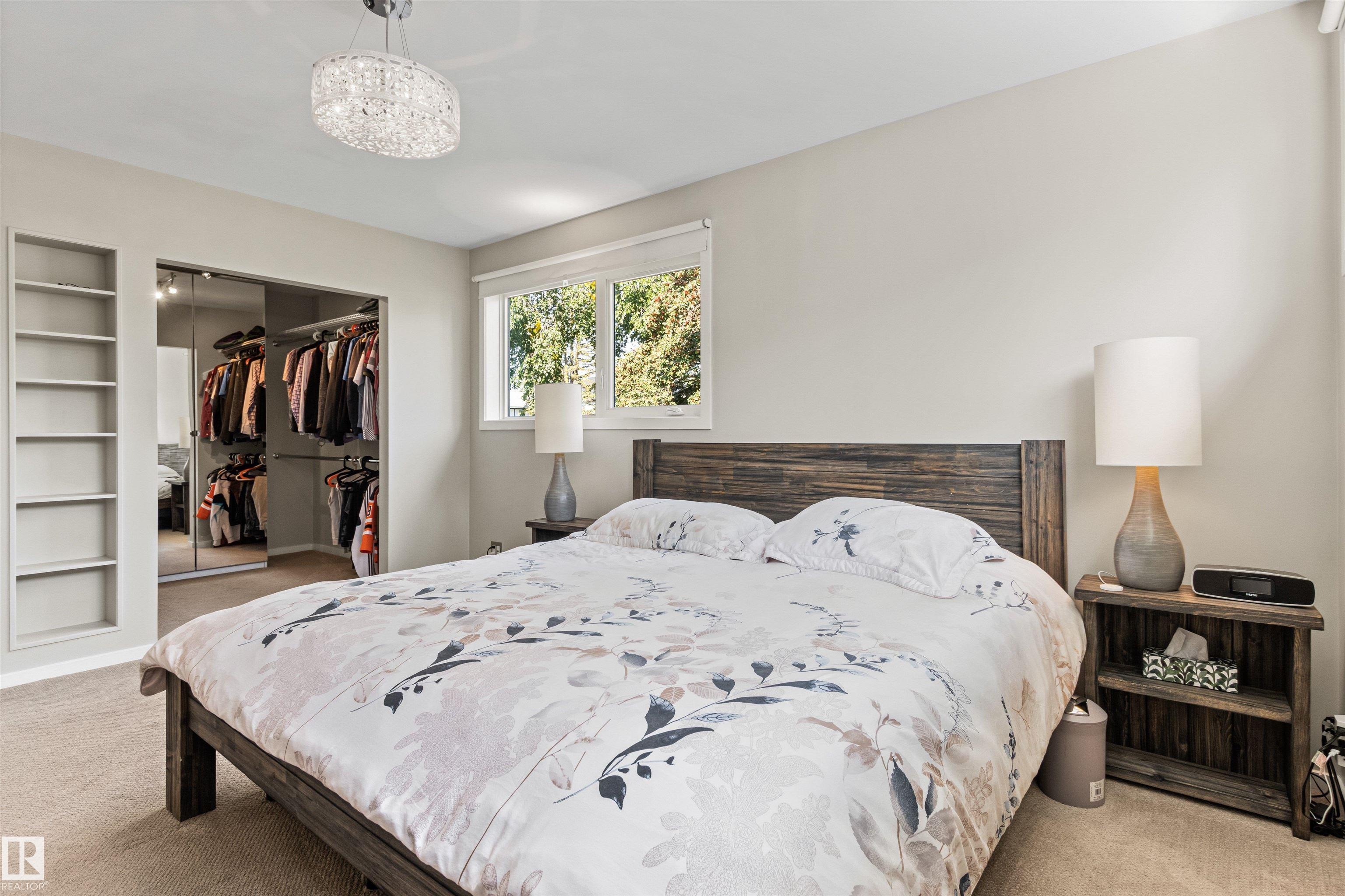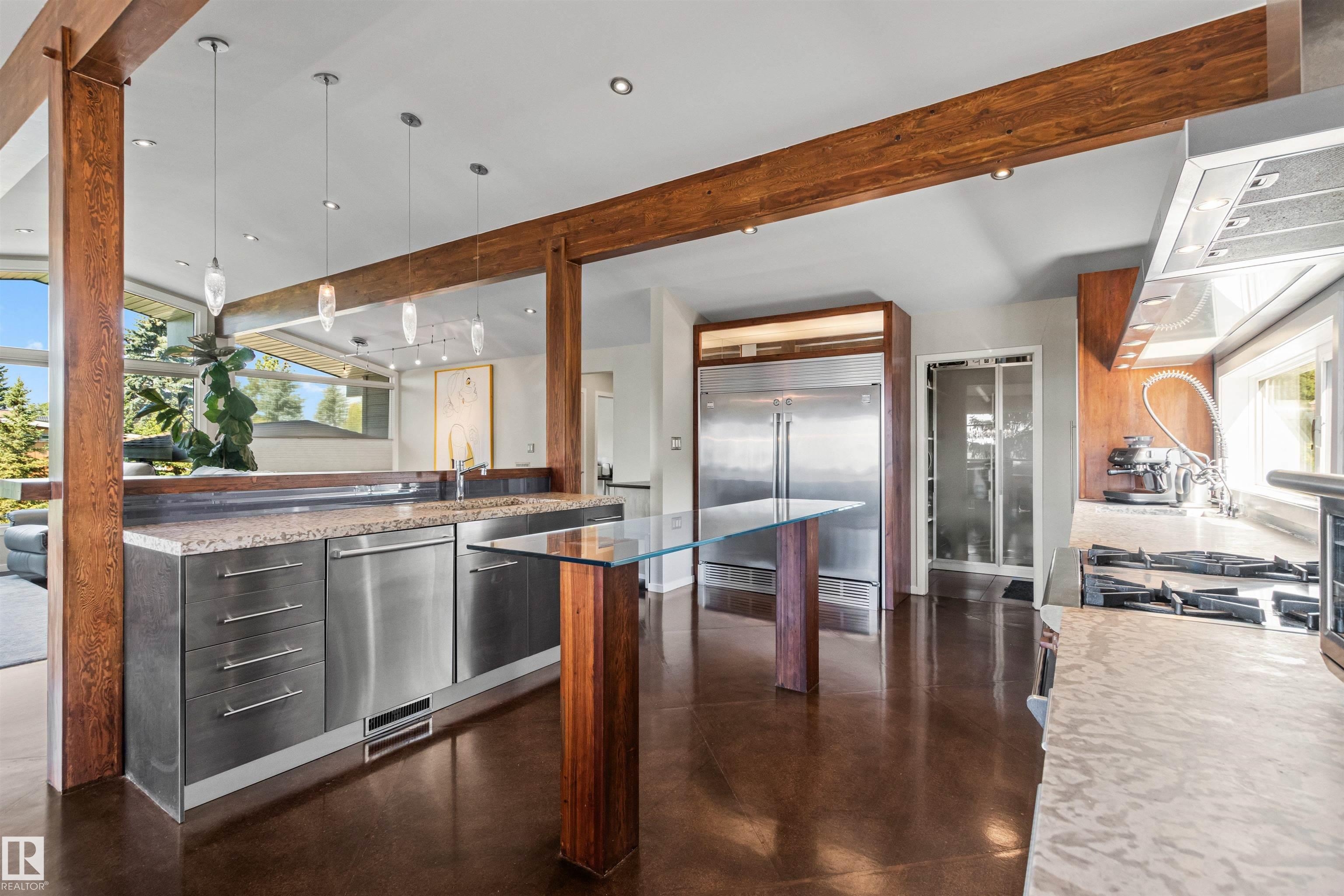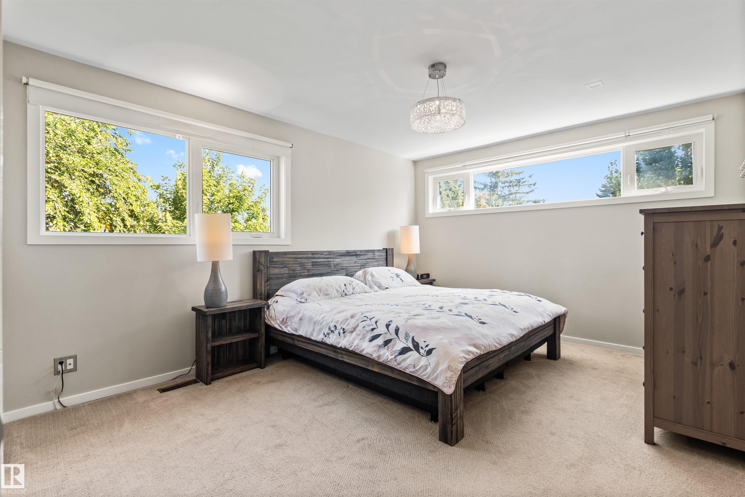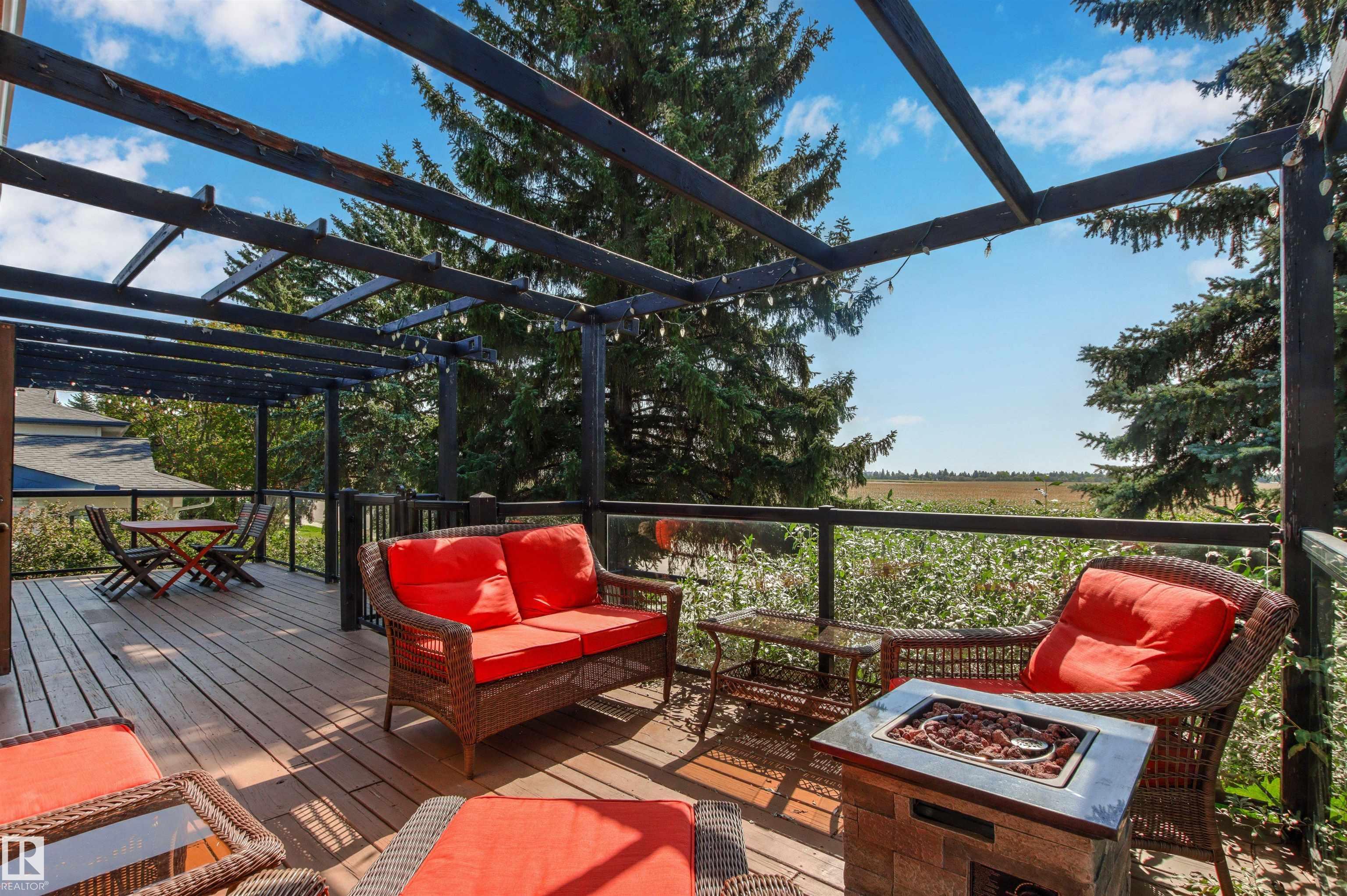 Welcome to this beautifully renovated & updated 1646 sq ft bi-level located in the desirable Grandview Heights steps to the highly rated K-9 school, the trail systems of the river valley, the U of A & hospitals, & a short commute to downtown. The main floor offers a chic modern kitchen with stainless steal cabinetry, limestone counters, high end appliances, solid wood accents & unique glass island. Natural light streams through a wall of soaring windows into the adjacent living room with a gas fireplace & limestone surround. The dining room, also with a huge window has garden door access to the west deck overlooking the farm. Three bedrooms, one with a 3-piece ensuite, a 2-piece powder room & a spacious W-I pantry complete the main level. The fully developed lower level has a rec room with a wood-burning fireplace, two additional bedrooms, a 4-pce bathroom/laundry, & access to the over-sized heated double attached garage. Over 100K has recently been spent on upgrades in this terrific move-in ready home.