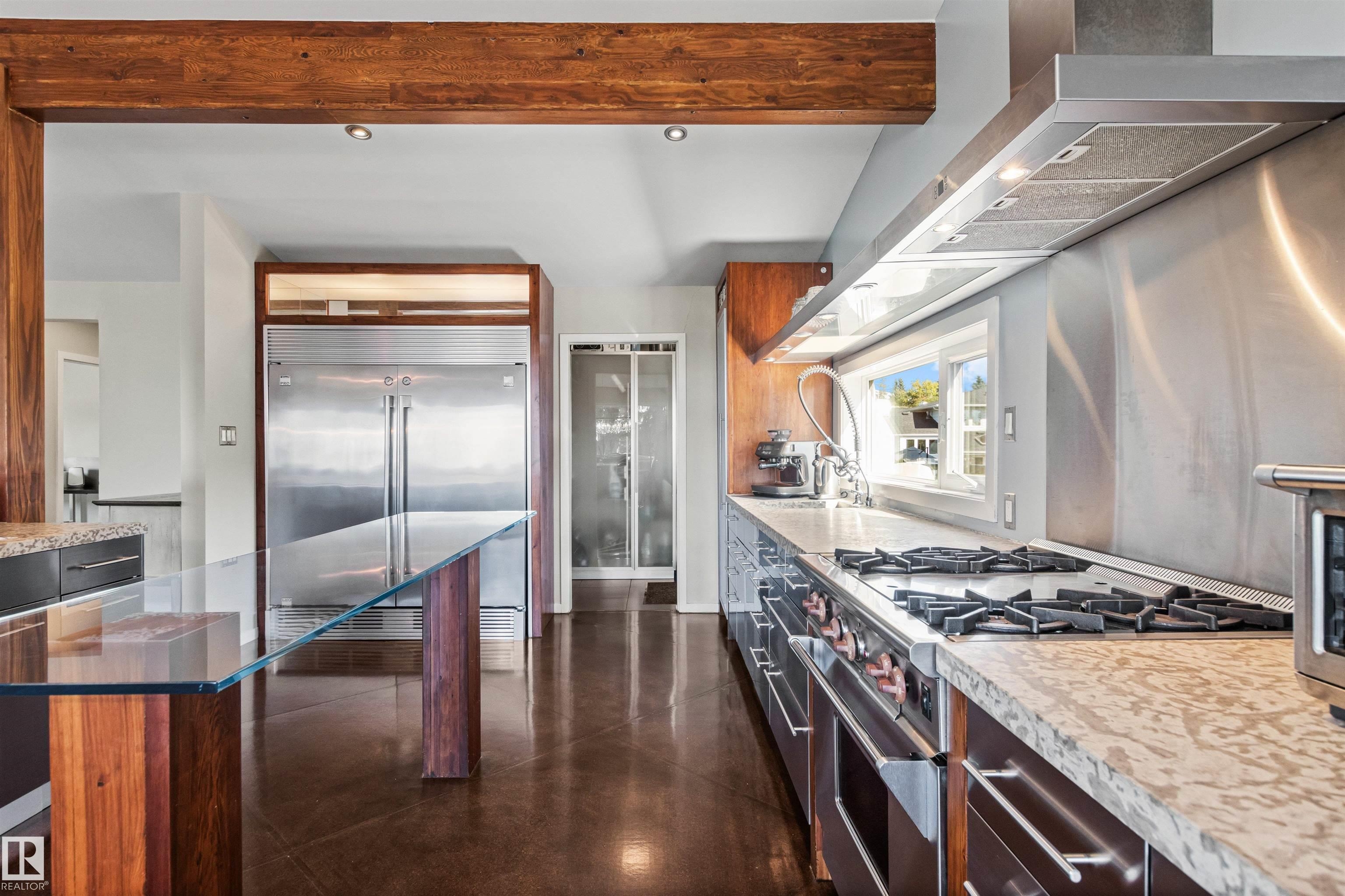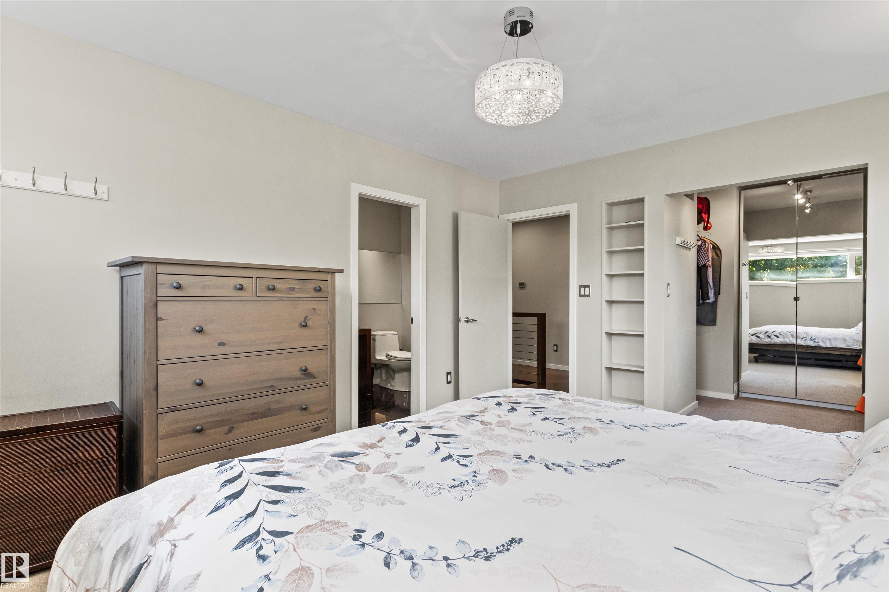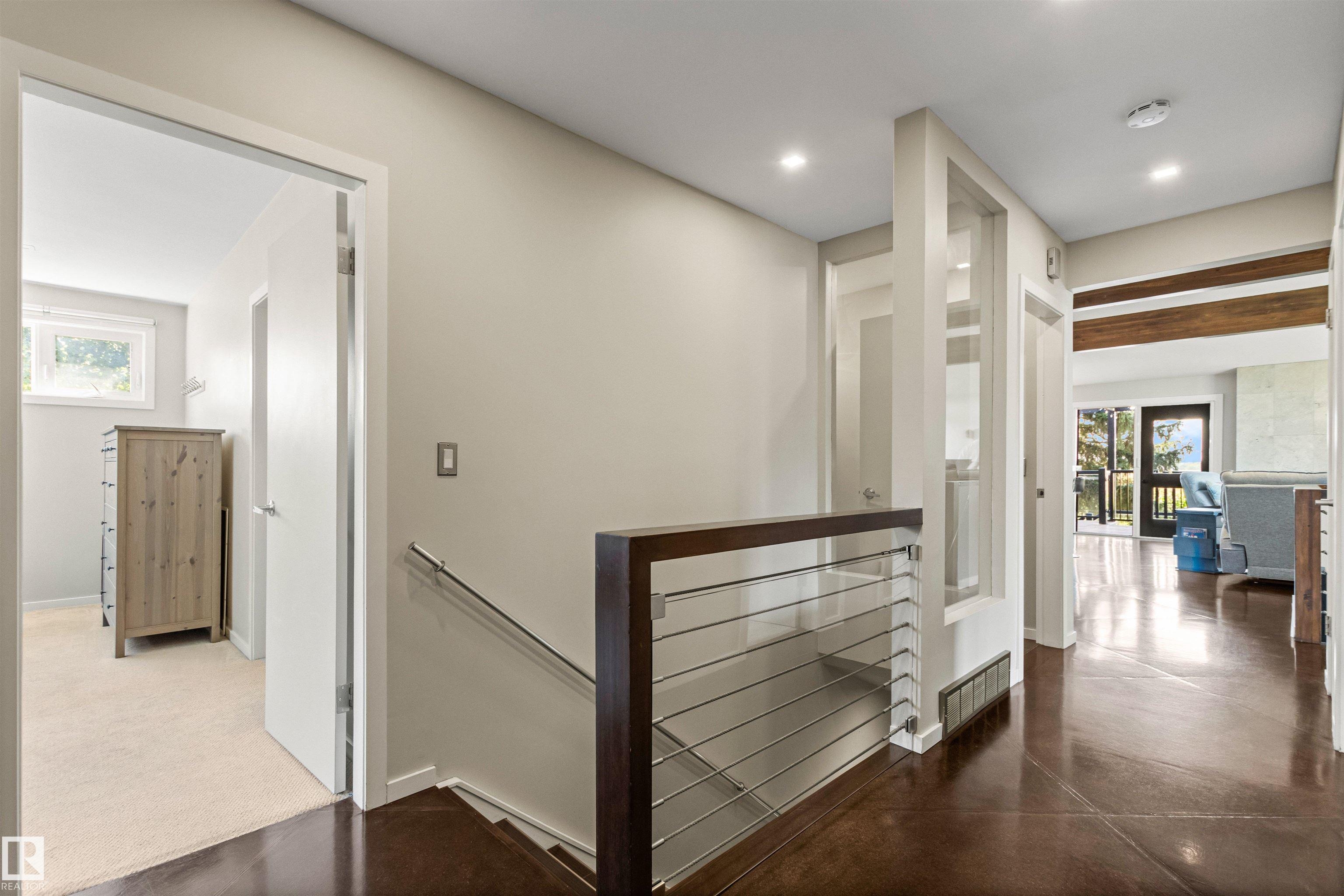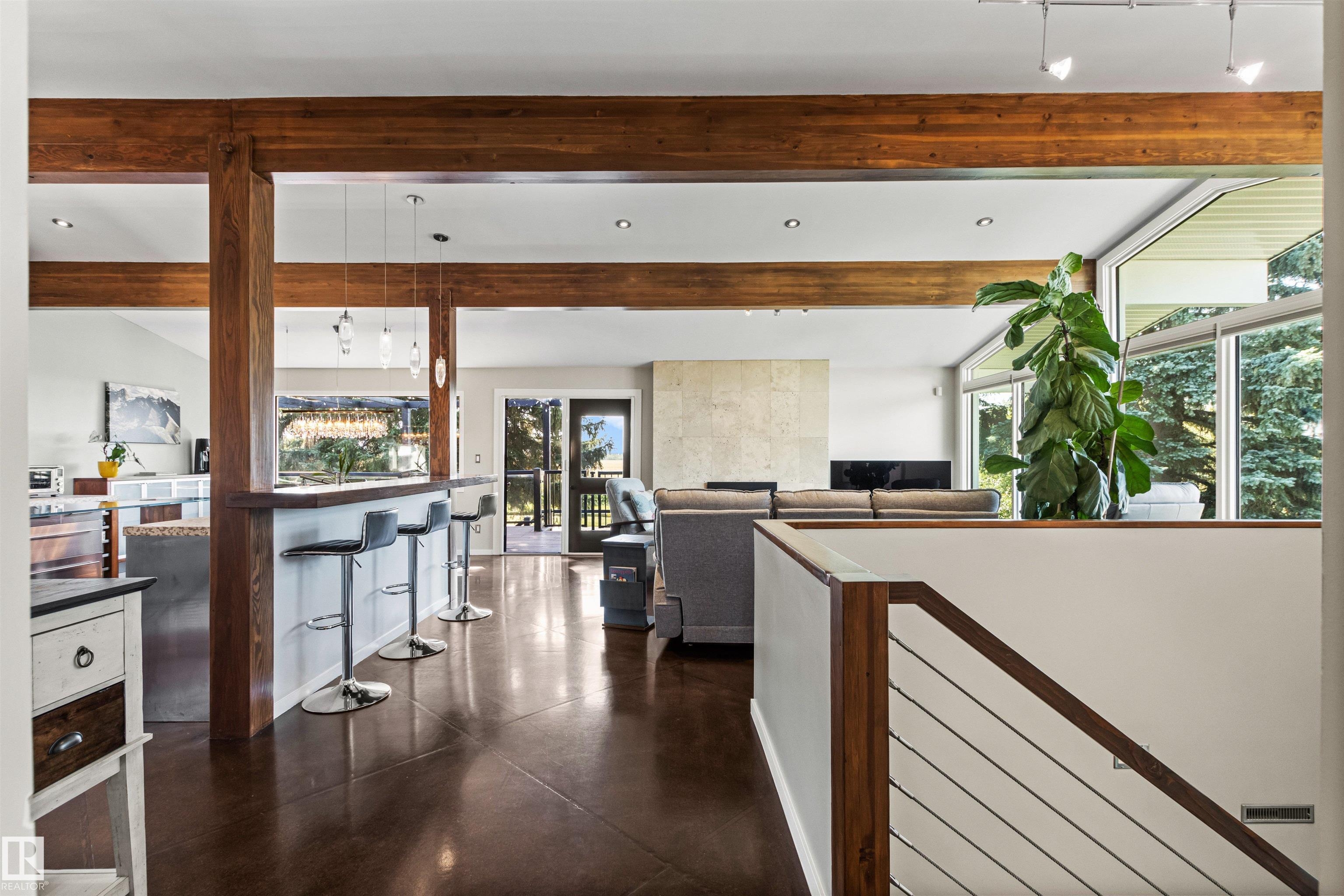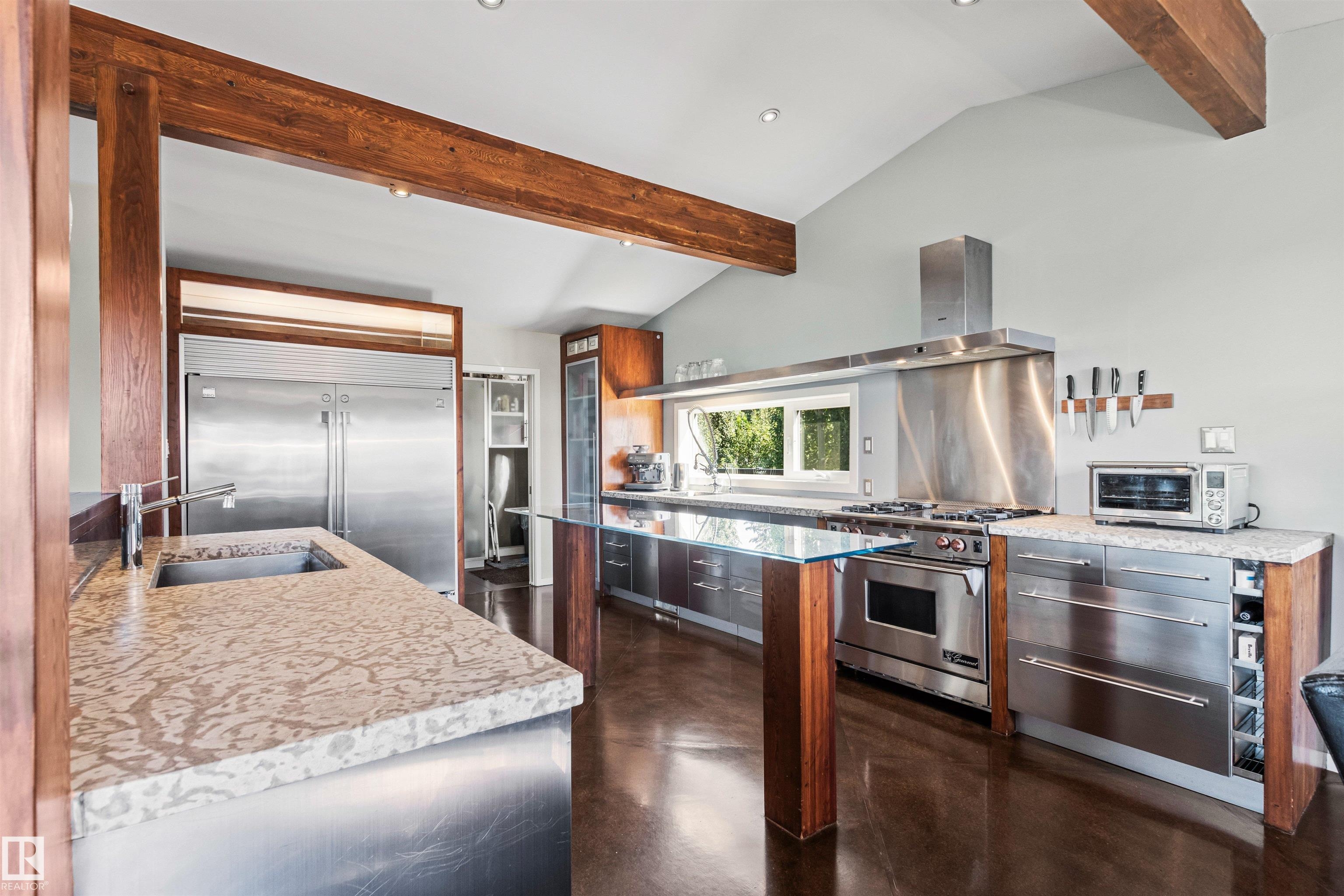Welcome to this beautifully renovated & updated 1646 sq ft bi-level located in the desirable Grandview Heights steps to the highly rated K-9 school, the trail systems of the river valley, the U of A & hospitals, & a short commute to downtown. The main floor offers a chic modern kitchen with stainless steal cabinetry, limestone counters, high end appliances, solid wood accents & unique glass island. Natural light streams through a wall of soaring windows into the adjacent living room with a gas fireplace & limestone surround. The dining room, also with a huge window has garden door access to the west deck overlooking the farm. Three bedrooms, one with a 3-piece ensuite, a 2-piece powder room & a spacious W-I pantry complete the main level. The fully developed lower level has a rec room with a wood-burning fireplace, two additional bedrooms, a 4-pce bathroom/laundry, & access to the over-sized heated double attached garage. Over 100K has recently been spent on upgrades in this terrific move-in ready home.