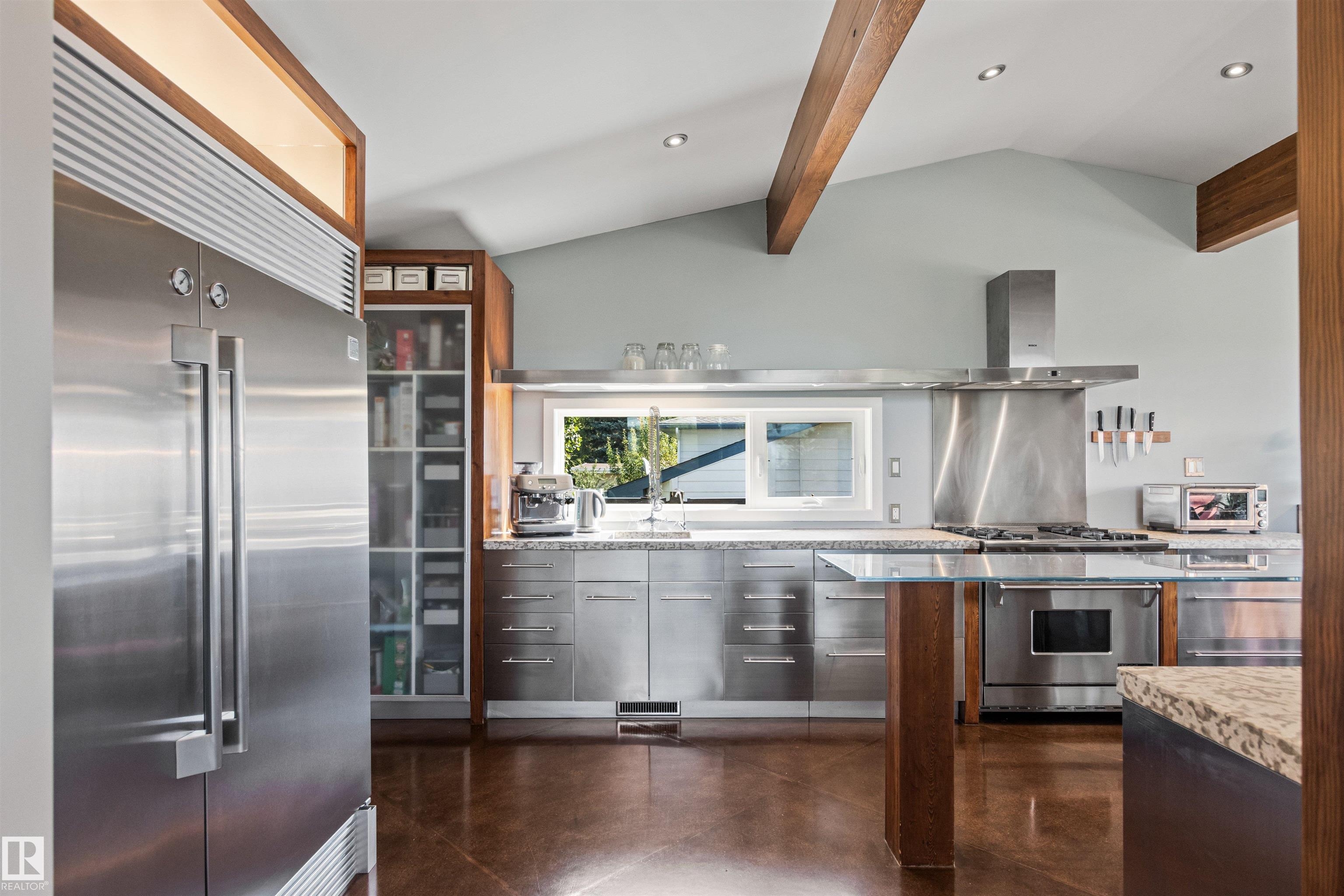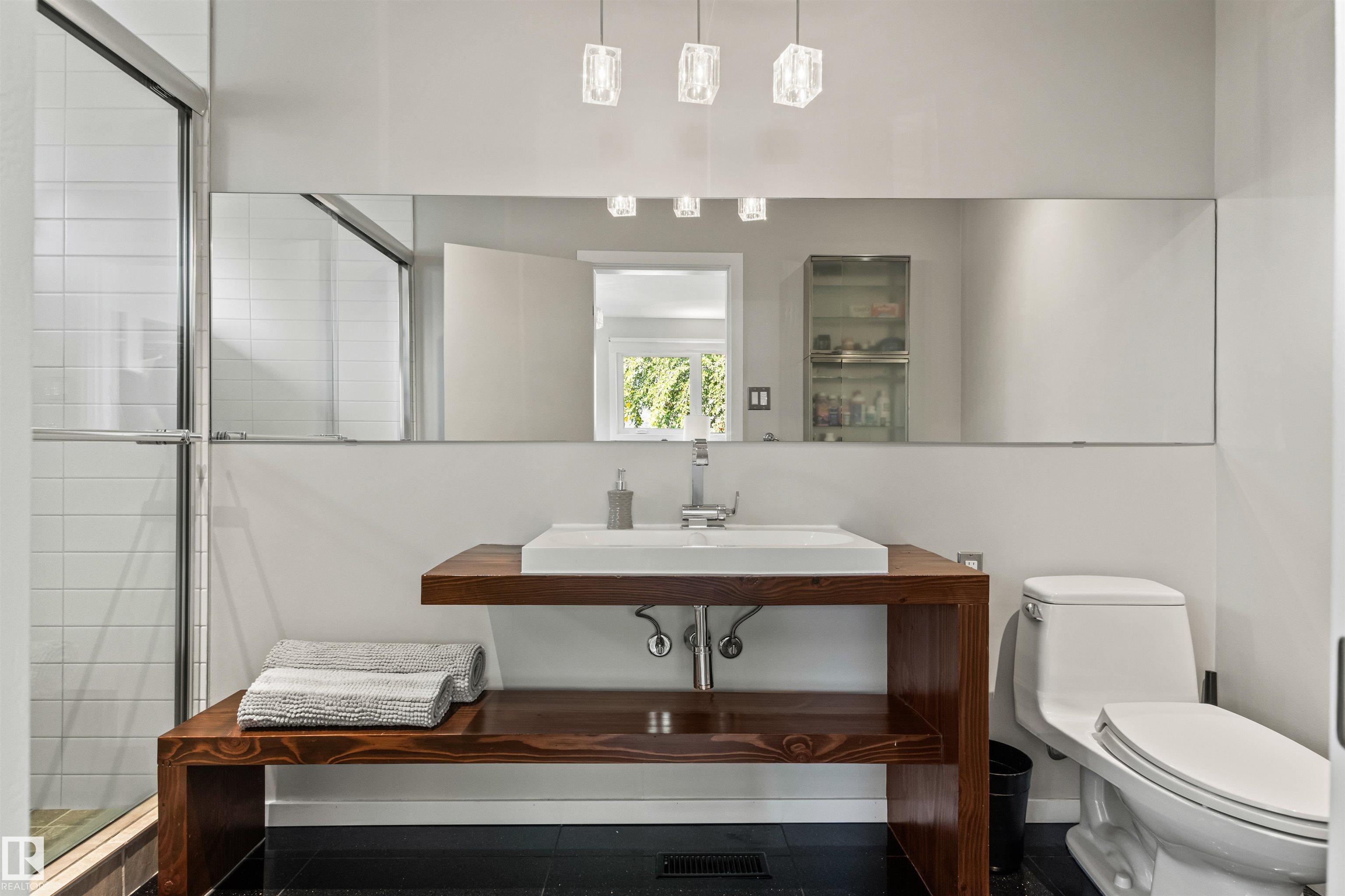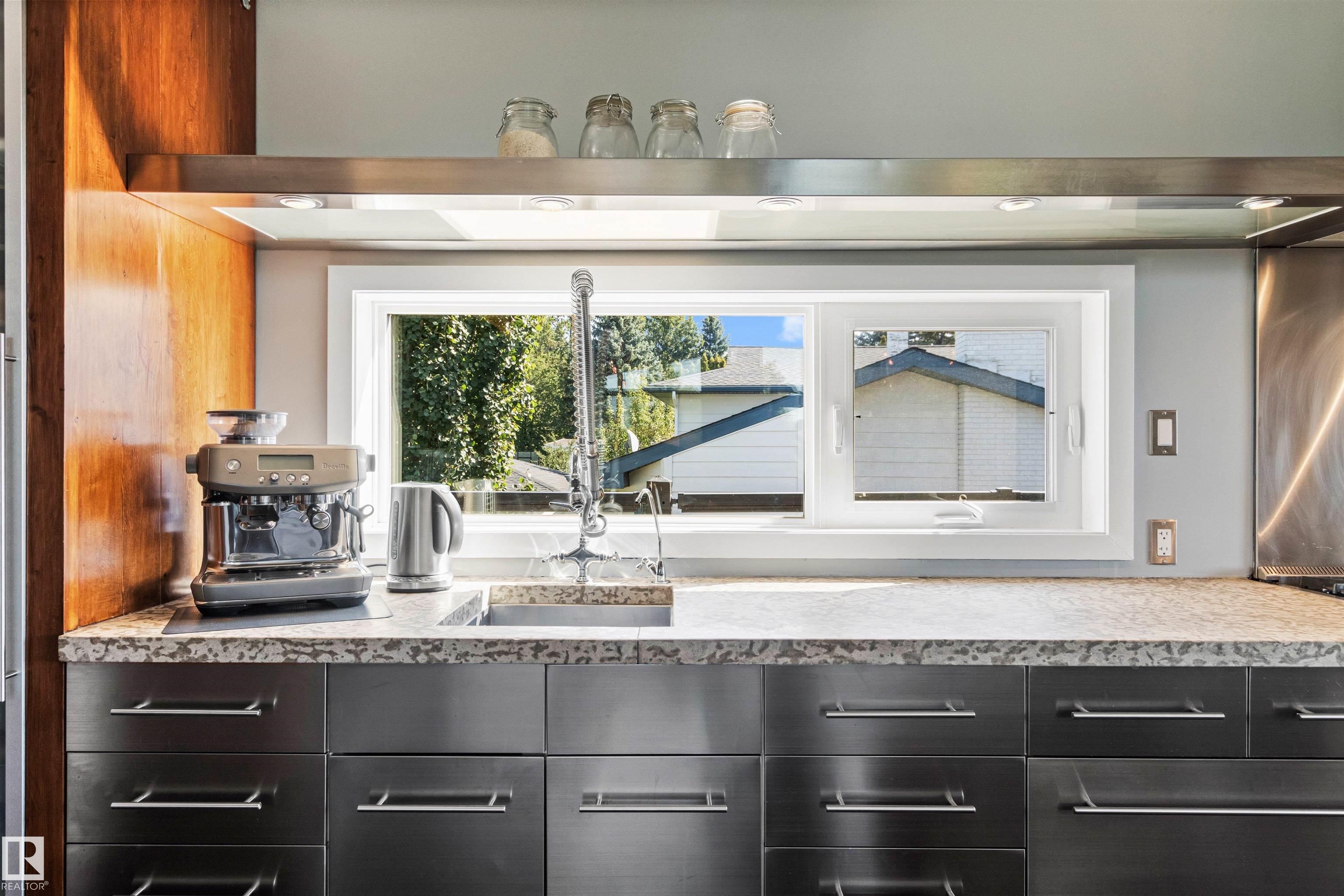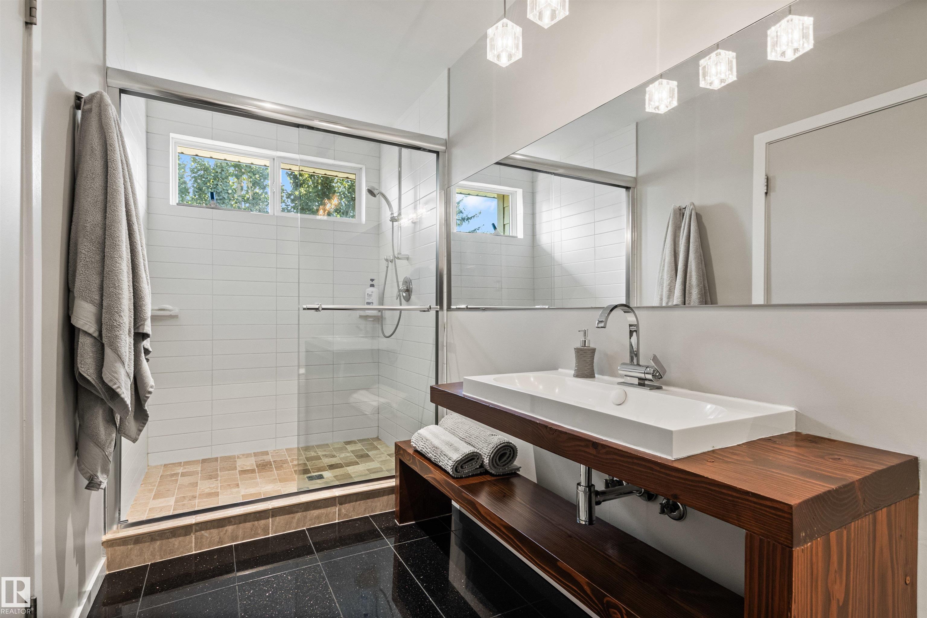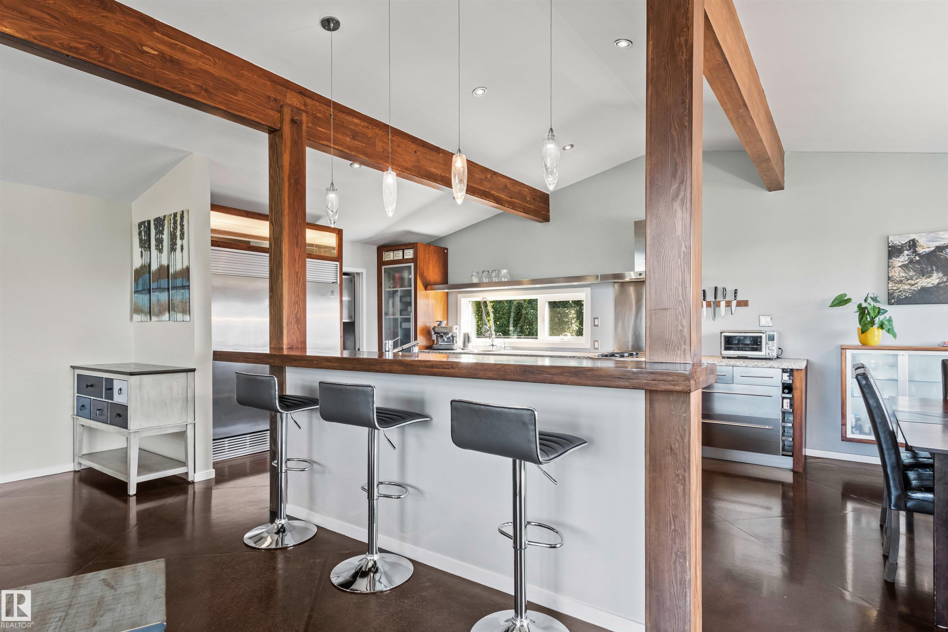 Welcome to this beautifully renovated & updated 1646 sq ft bi-level located in the desirable Grandview Heights steps to the highly rated K-9 school, the trail systems of the river valley, the U of A & hospitals, & a short commute to downtown. The main floor offers a chic modern kitchen with stainless steal cabinetry, limestone counters, high end appliances, solid wood accents & unique glass island. Natural light streams through a wall of soaring windows into the adjacent living room with a gas fireplace & limestone surround. The dining room, also with a huge window has garden door access to the west deck overlooking the farm. Three bedrooms, one with a 3-piece ensuite, a 2-piece powder room & a spacious W-I pantry complete the main level. The fully developed lower level has a rec room with a wood-burning fireplace, two additional bedrooms, a 4-pce bathroom/laundry, & access to the over-sized heated double attached garage. Over 100K has recently been spent on upgrades in this terrific move-in ready home.