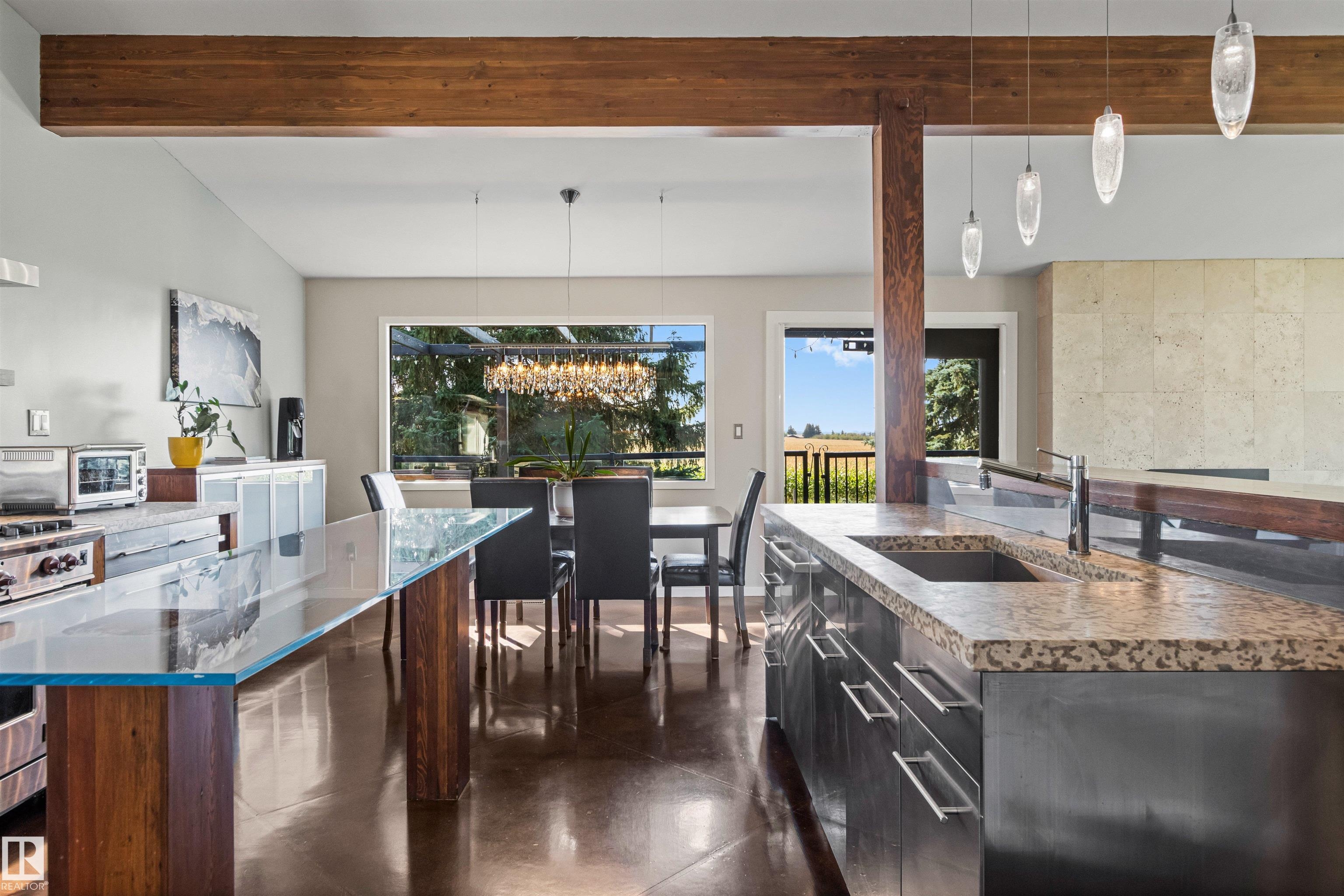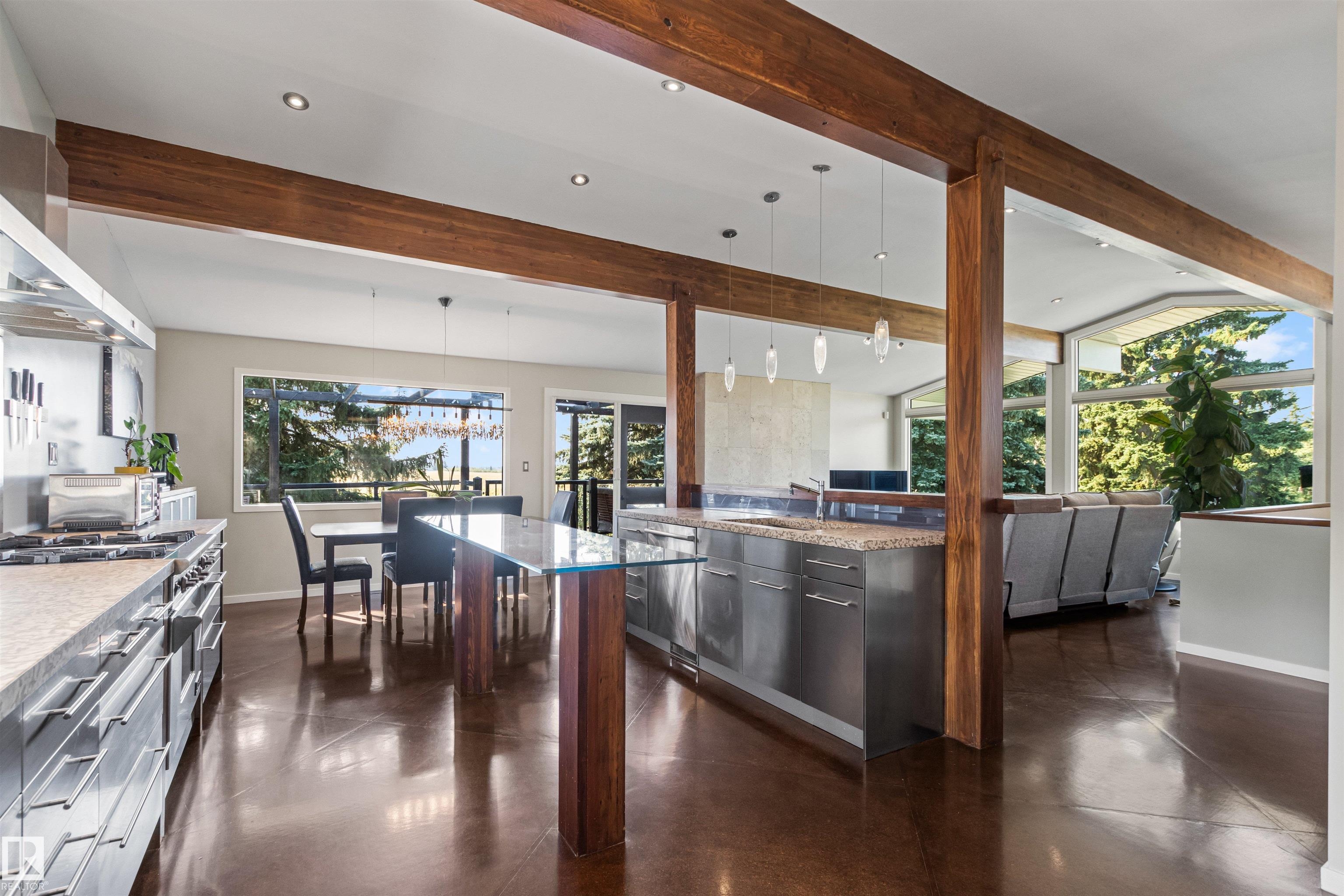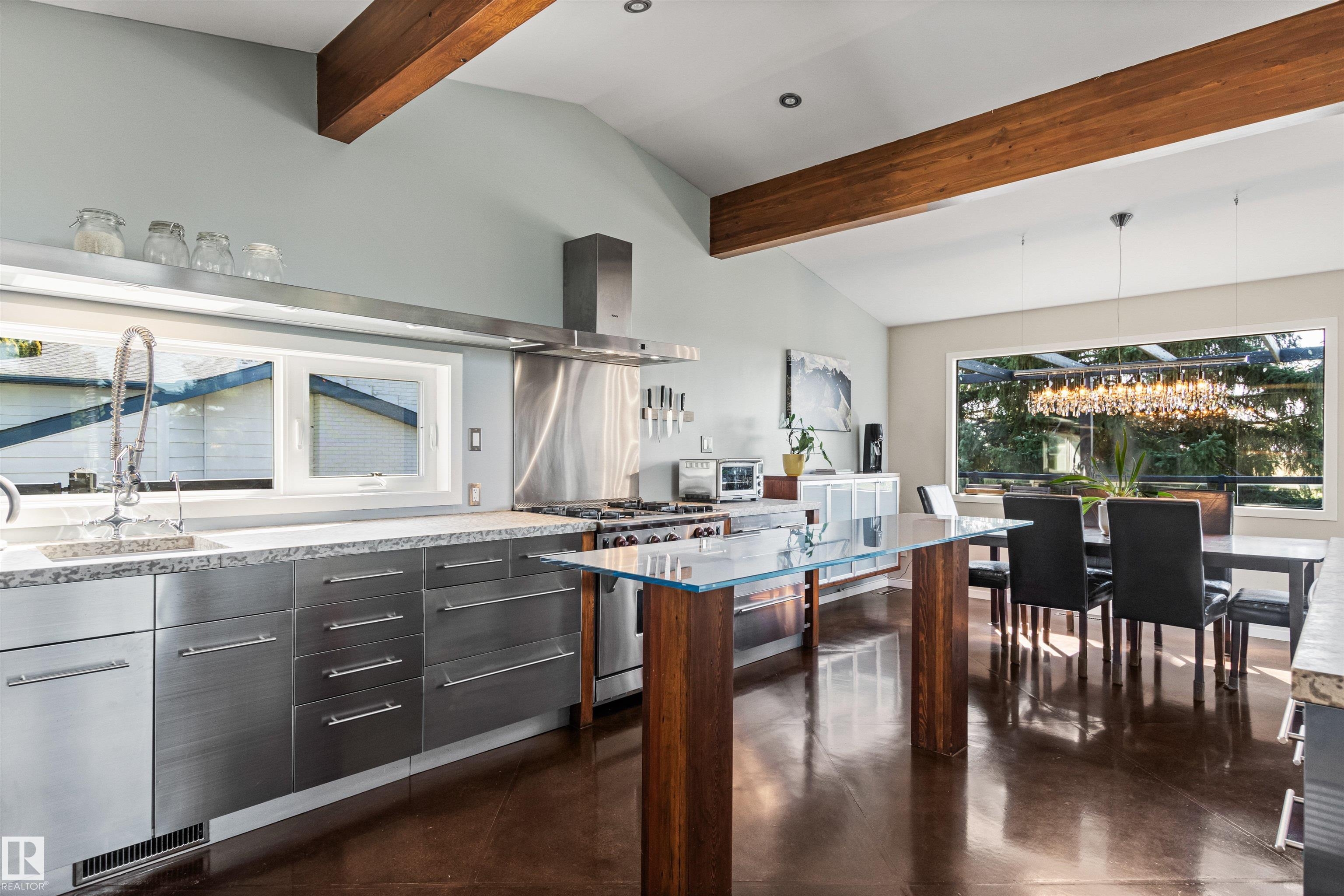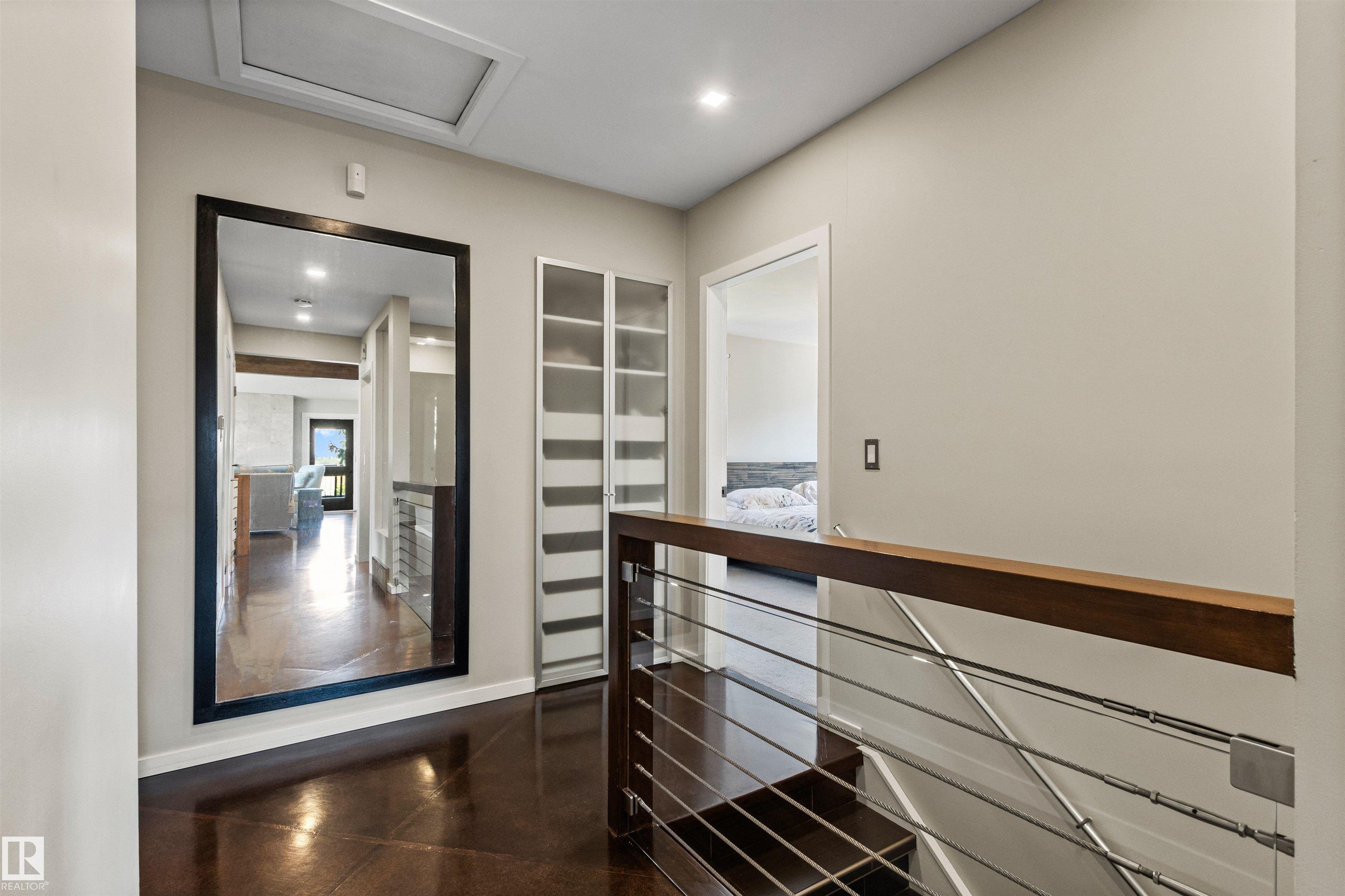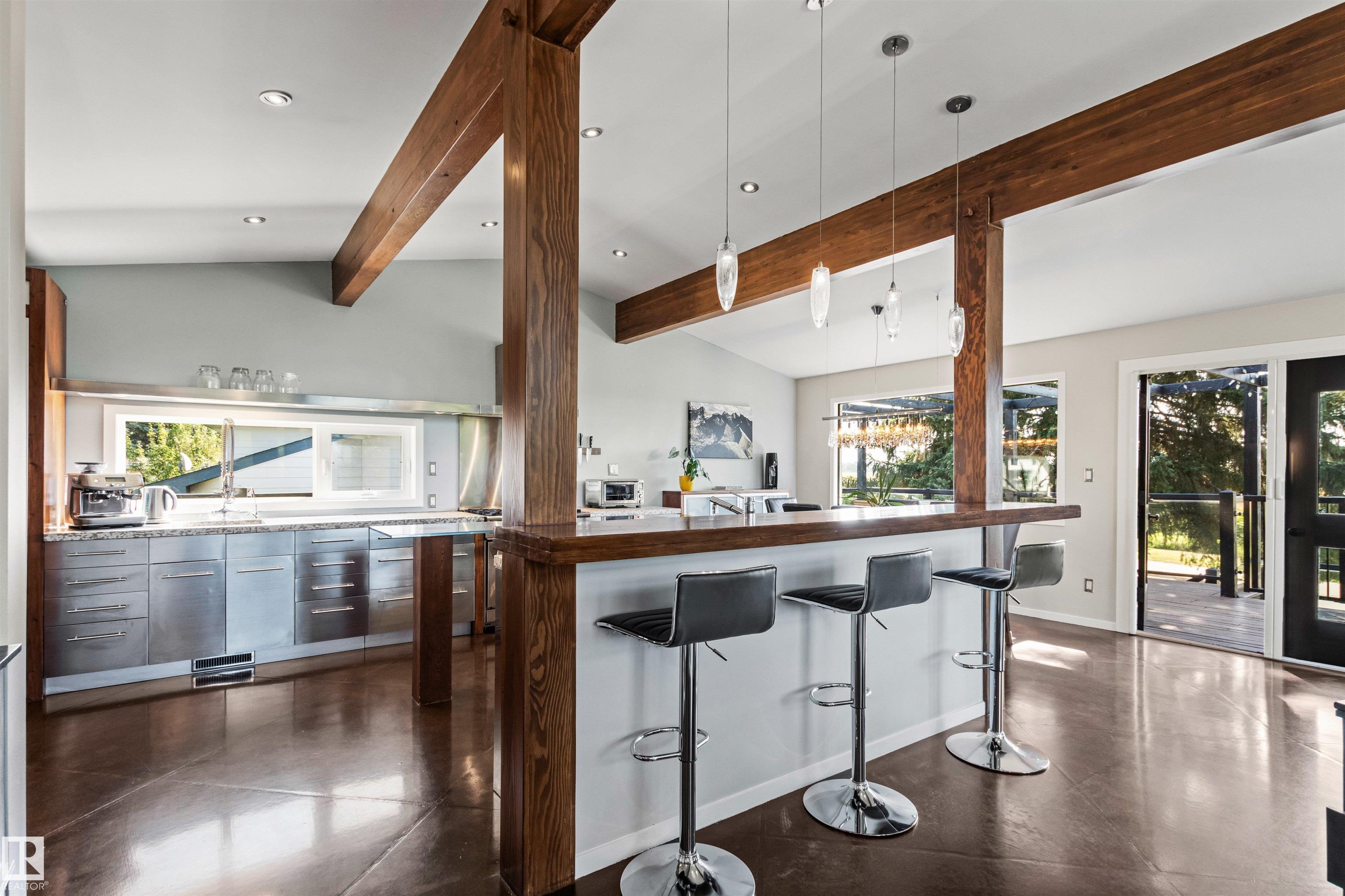 Welcome to this beautifully renovated & updated 1646 sq ft bi-level located in the desirable Grandview Heights steps to the highly rated K-9 school, the trail systems of the river valley, the U of A & hospitals, & a short commute to downtown. The main floor offers a chic modern kitchen with stainless steal cabinetry, limestone counters, high end appliances, solid wood accents & unique glass island. Natural light streams through a wall of soaring windows into the adjacent living room with a gas fireplace & limestone surround. The dining room, also with a huge window has garden door access to the west deck overlooking the farm. Three bedrooms, one with a 3-piece ensuite, a 2-piece powder room & a spacious W-I pantry complete the main level. The fully developed lower level has a rec room with a wood-burning fireplace, two additional bedrooms, a 4-pce bathroom/laundry, & access to the over-sized heated double attached garage. Over 100K has recently been spent on upgrades in this terrific move-in ready home.